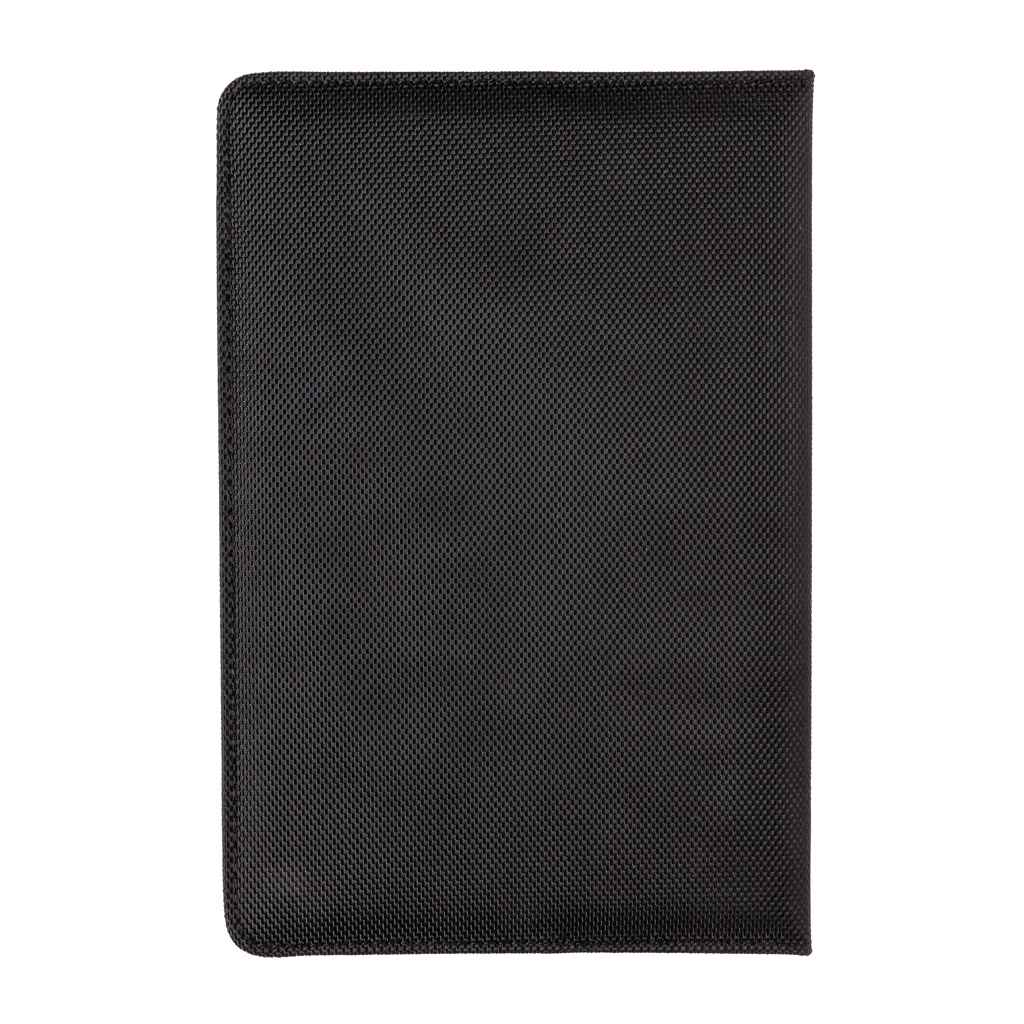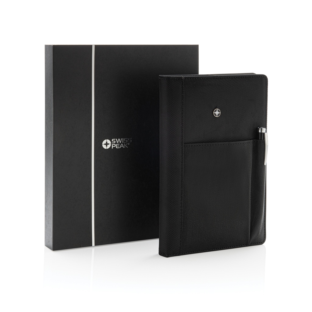 Executive 1680D ja 600D polüestrist märkmiku kate koos pliiatsiga. Kaasa arvatud eemaldatav märkmik, mille sees on 192 lehekülge 80g/m2 paberit. Kaanel olev tasku mahutab pliiatsit, kaarte, sularaha, mobiiltelefoni jne. Pakitud Swiss Peak kinkekarpi.