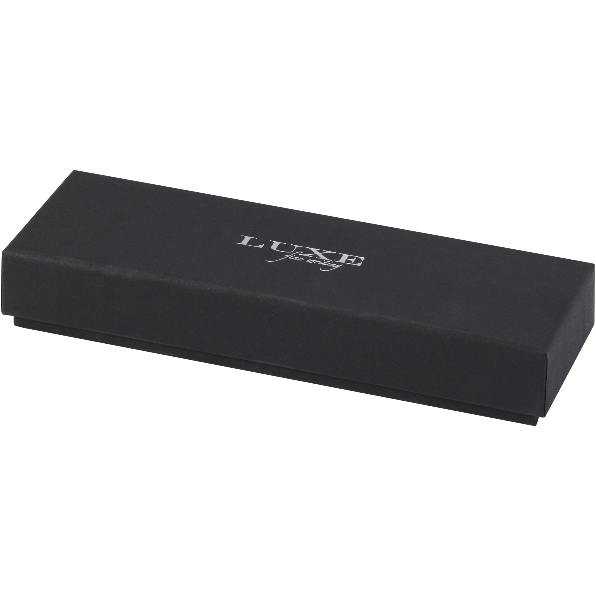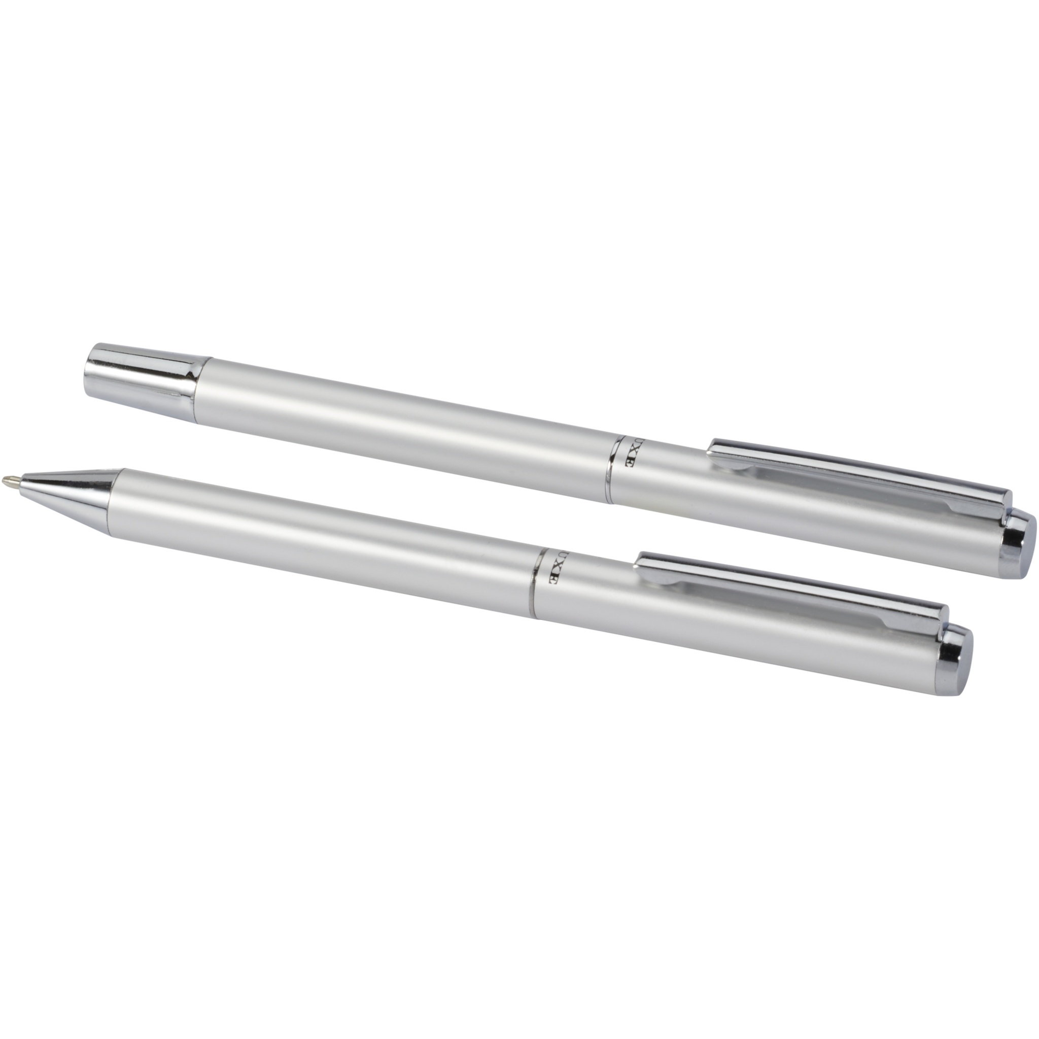 Selle pastapliiatsi ja rullpallikomplekti pliiatsitorud on valmistatud mattvärvilisest anodeeritud taaskasutatud alumiiniumist koos läikivate kroomitud tarvikutega. Alumiinium on väga taaskasutatav materjal ja selle pliiatsikomplekti valimisega saate toetada säästvamaid tavasid ja anda kasutuselt kõrvaldatud alumiiniummaterjalidele uue elu. Need pastakad on praktiline ja säästvam valik üksikisikutele ja organisatsioonidele, kes otsivad keskkonnasõbralikke kirjutusvahendeid. Pliiatsi tindi värv: must. Otsa suurus: 1,0 mm. Kirjutamise pikkus: 800 meetrit. Tarnitakse mustas siidipaelaga mustas kinkekarbis. Karbi suurus: 16,2 x 5,1 x 2,7 cm.