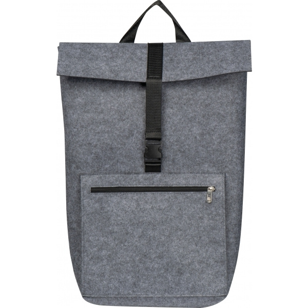 Kvaliteetne taaskasutatud vildist seljakott. Lisaks mahukale reguleeritava kinnisega sisesahtlile on sellel lukuga eesmine sahtel ja reguleeritavad polsterdatud õlarihmad. Teie logo asetatakse esiosasse.