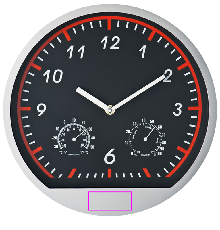 Laheda spordikujundusega seinakell. Kellal on termomeeter ja hügromeeter. Trükime teie logo kuue all olevale raamile. Välja arvatud üks AA patarei (tellige see kohe, vt viimast lehte või artiklit 999300).