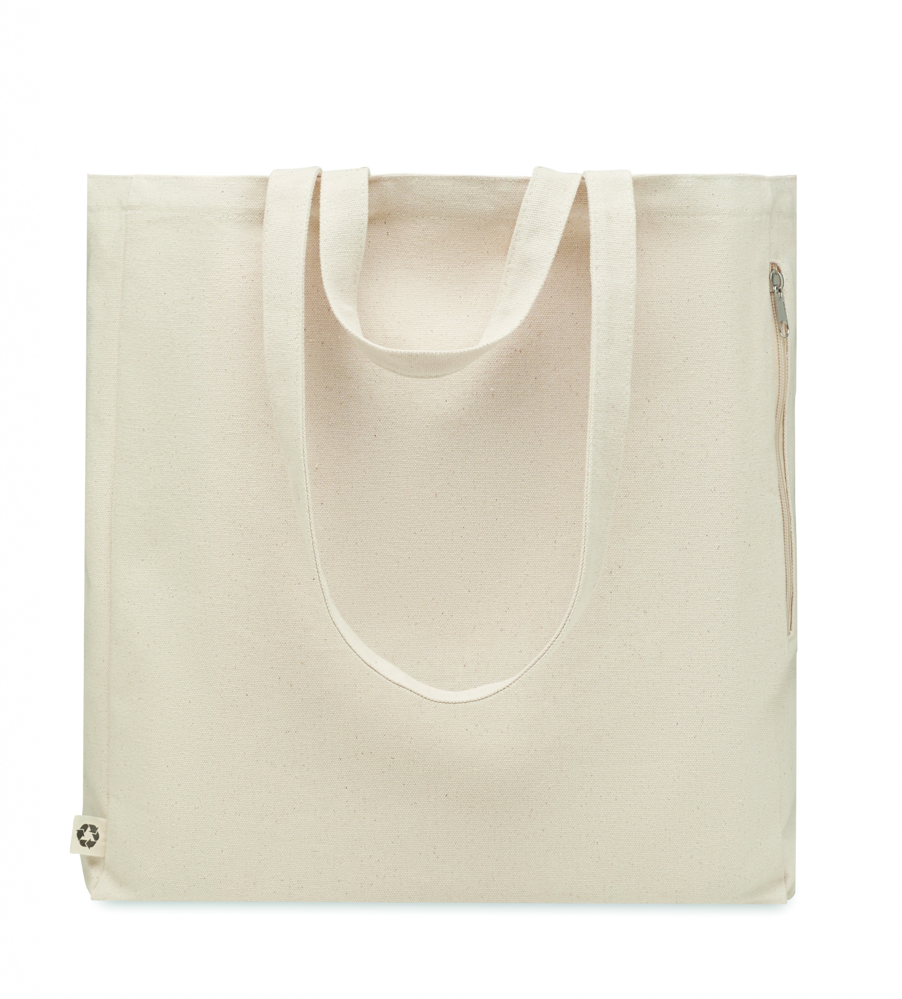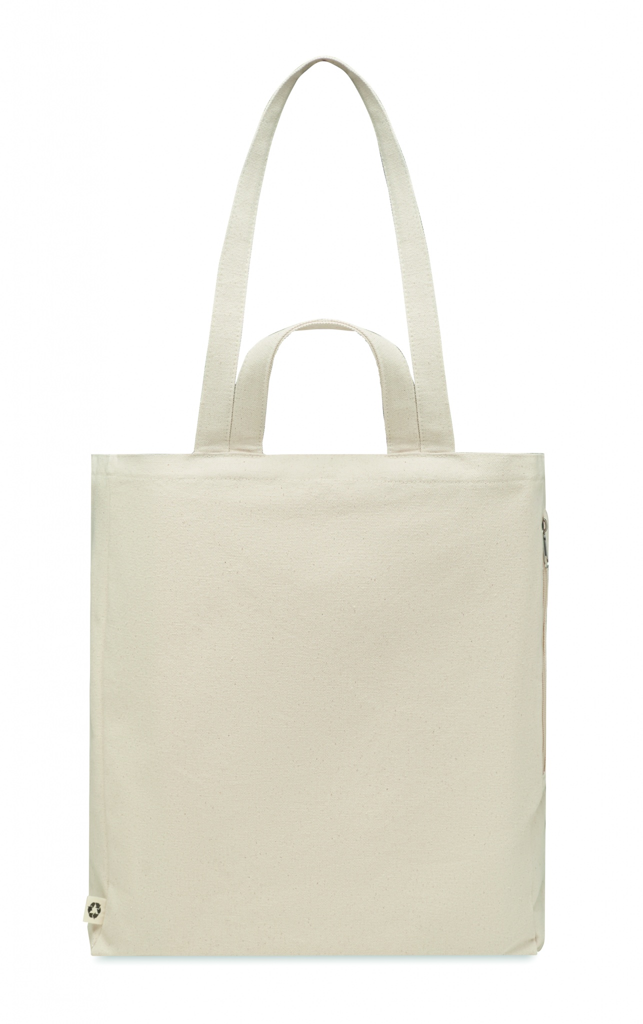 Taaskasutatud polüpuuvillasest ostu- või rannakott (70% taaskasutatud puuvill, 30% taaskasutatud polüester) lühikeste sangadega. Sellel on külgmine lukuga tasku. 380 gr/m².