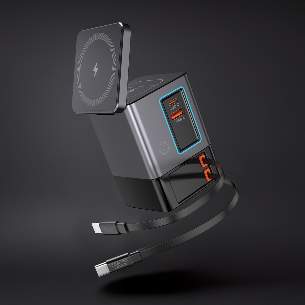 Sacramento 105 W GaN-laadimisjaam ühendab maksimaalse võimsuse mugavusega. Sellel on kaks integreeritud sissetõmmatavat 65 W USB-C-kaablit, nii et teil on alati kiire laadimine käeulatuses – lisakaableid pole vaja. Sacramentol on ka USB-A ja USB-C-port, pakkudes kokku nelja väljundvõimalust sülearvutite, tahvelarvutite ja nutitelefonide laadimiseks – kõike korraga. Sacramento on varustatud võimsa 15 W magnetilise juhtmevaba laadijaga, mis hoiab teie telefoni kindlalt paigal, ning eraldi traadita alusega, mis on loodud spetsiaalselt väiksemate esemete, näiteks kõrvaklappide või AirPodide jaoks (maksimaalselt 5 W). See laadimisjaam on valmistatud RCS-sertifikaadiga (Recycled Claim Standard) taaskasutatud tulekindlast polükarbonaatmaterjalist. Taaskasutatud materjali kogusisaldus: 26% eseme kogukaalust.