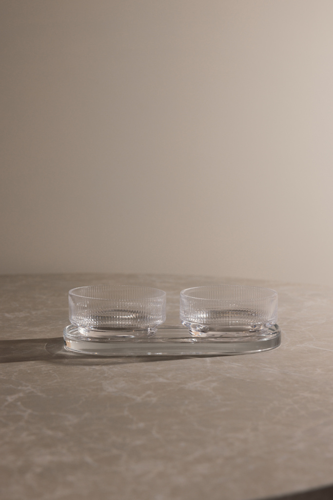 Ajatu disaini ja klassikaliste puhaste joontega serveerimisnõude komplekt. Ideaalne igaks sündmuseks, kus soovite serveerida väikeseid roogasid, suupisteid või muid lisandeid stiilselt ja elegantselt. Komplekt sisaldab kahte kaussi ja kandikut, mida saab kasutada koos või eraldi. Valmistatud soodaklaasist. Kausside maht on 250 ml. Nõudepesumasinas pestav.