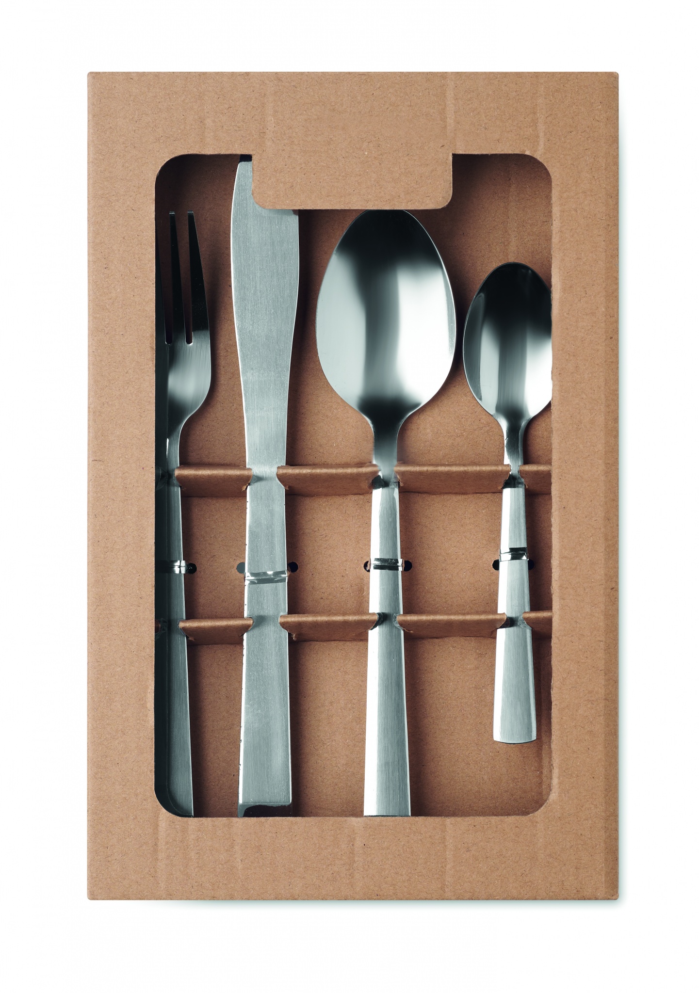 16-osainen ruostumattomasta teräksestä valmistettu ruokailuvälinesarja 4 kattaukseen. Sisältää: teelusikka, ruokalusikka, haarukka, veitsi. Toimitetaan voimapaperilaatikossa.