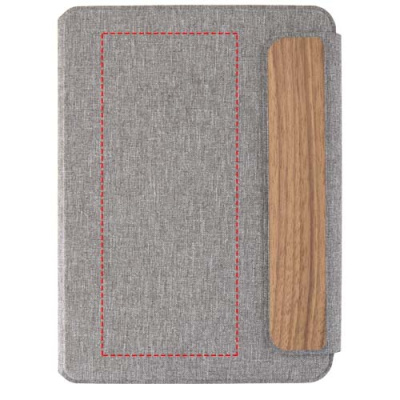 A5-kokoinen Andean-portfolio on valmistettu osittain RCS-sertifioidusta kierrätetystä polyesteristä, mikä tarjoaa kestävämmän vaihtoehdon vähentämällä kokonaan uusien materiaalien käyttöä. Tyylikkäissä, harmaissa, kovissa kansissa on pyöristetyt kulmat, ja ne on tehty tarkkuushitsaustekniikalla. Portfolio kiinnitetään magneettisella sulkimella, jota korostava hienostunut, pähkinäpuinen yksityiskohta lisää modernia ja hienostunutta ilmettä. Sisäpuolella on irrotettava pehmeäkantinen muistikirja, jossa on 64 kermanväristä, viivoitettua arkkia. Muistikirja on valmistettu vastuullisesti hankitusta 80 g/m²:n paperista. Toimitetaan voimapaperin värisessä paperitaskussa.