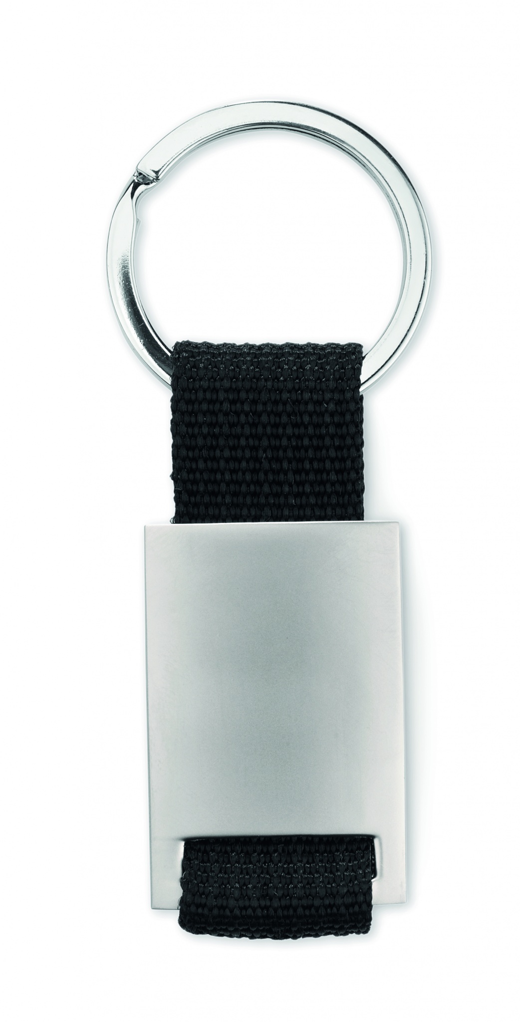 Metallinen avaimenperä värillisellä polyesterinauhalla.