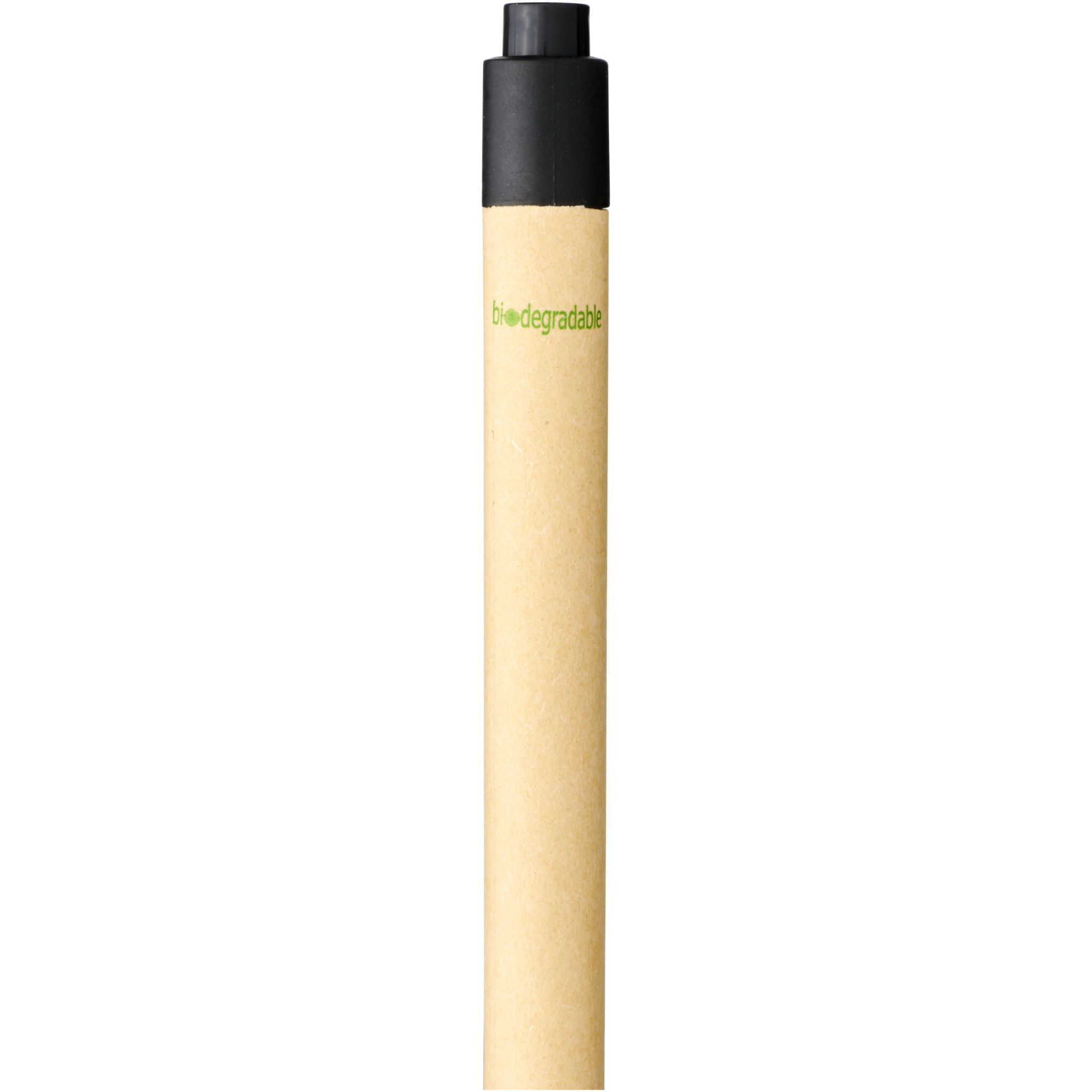 Ympäristöystävällinen kuulakärkikynä naksautusmekanismilla, varsi biohajoavaa paperimateriaalia, maissimuovikoristeet eri värivaihtoehdoilla. Kierrätetyn pahvin väri voi vaihdella.