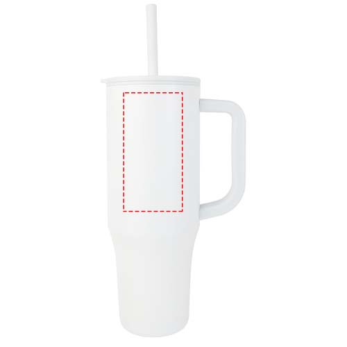 Juomamuki, jossa on kestävä ulkoseinä RCS-sertifioidusta kierrätetystä ruostumattomasta teräksestä ja sisäseinä muovista. Mukana on integroitu elintarvikelaatuinen silikonipilli ja roiskeenkestävä painettava kansi juomisen helpottamiseksi. Tämä muki sopii myös kuumille juomille, mutta niitä ei suositella juotavaksi pillillä. Jäähdytä juoma poistamalla kansi ennen nauttimista. Tilavuus: 900 ml. Käsinpesu.