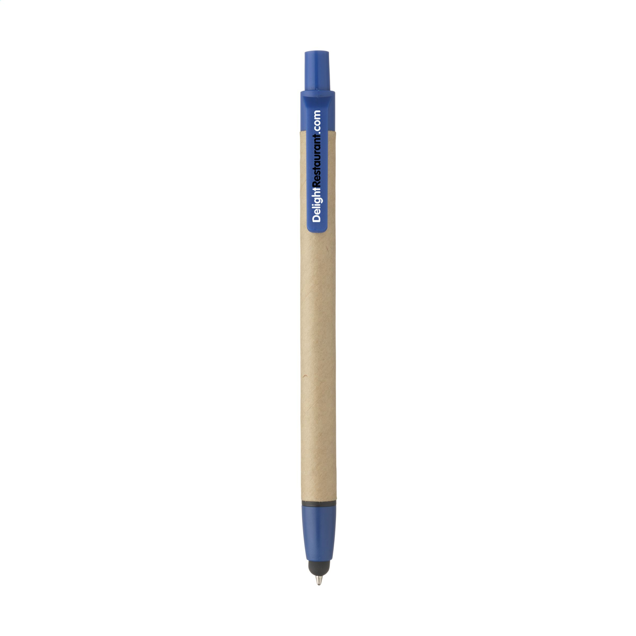 Vau! Sinisellä musteella varustettu kuulakärkikynä piippulla, valmistettu kierrätetystä pahvista, kumiosoittimella kosketusnäyttöjen ohjaamiseen ja muoviosilla.