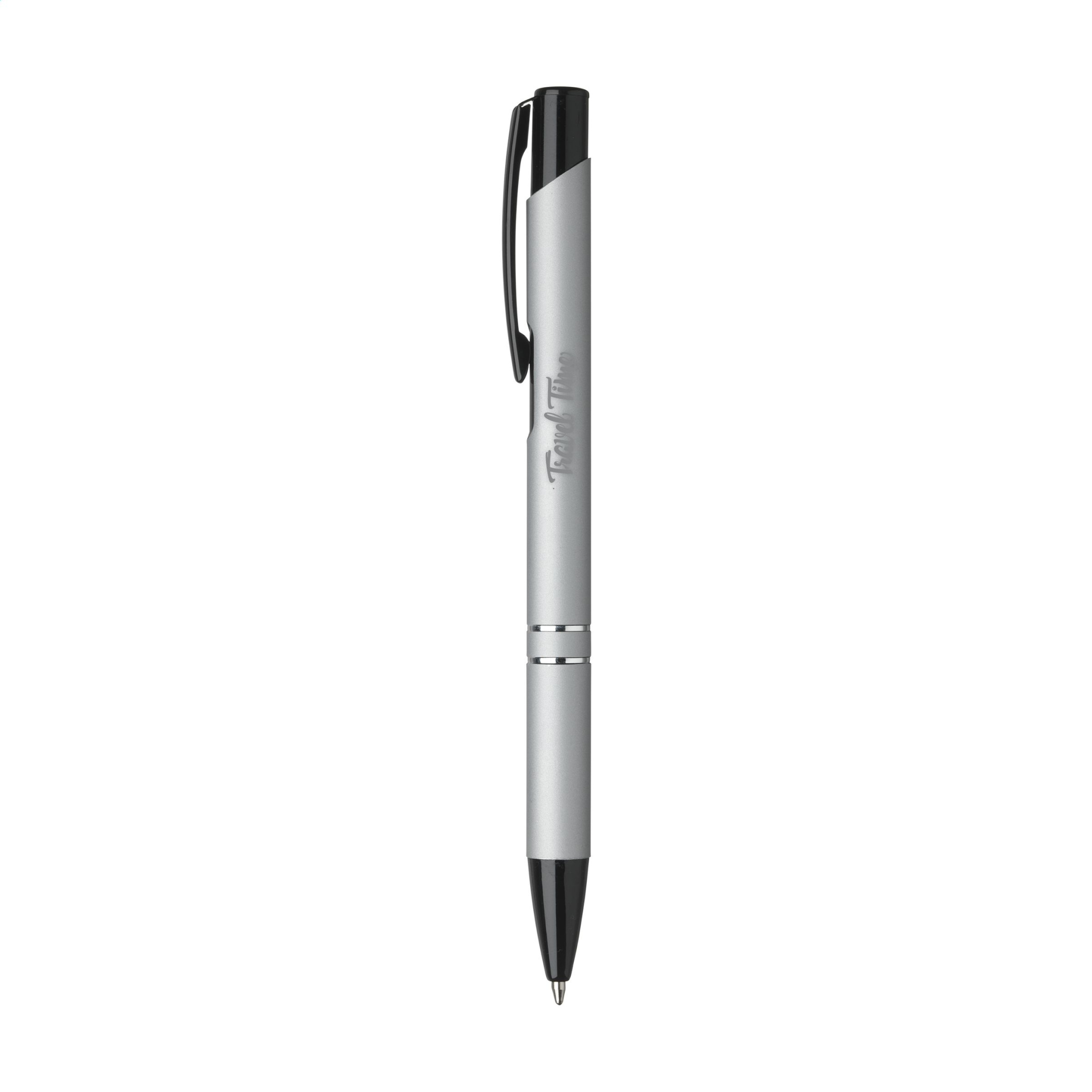 Sinisellä musteella varustettu kuulakärkikynä, jossa mustaksi maalattu painonappi/klipsi ja kärki, kromi lomitukset. Tynnyri on viimeistelty kumipinnoitteella.