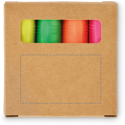 4 korostuskynän setti voimapaperirasiassa.