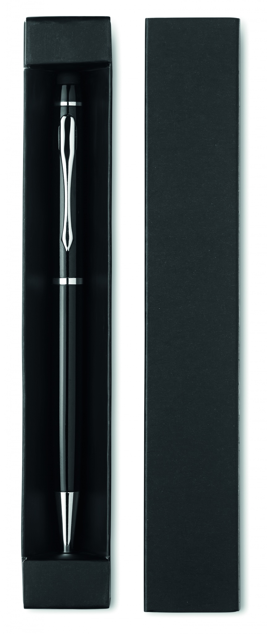 Alumiinen kuulakärkikynä sinisellä musteella ja kosketusnäyttöpäällä. Pakattuna lahjapakkaukseen.