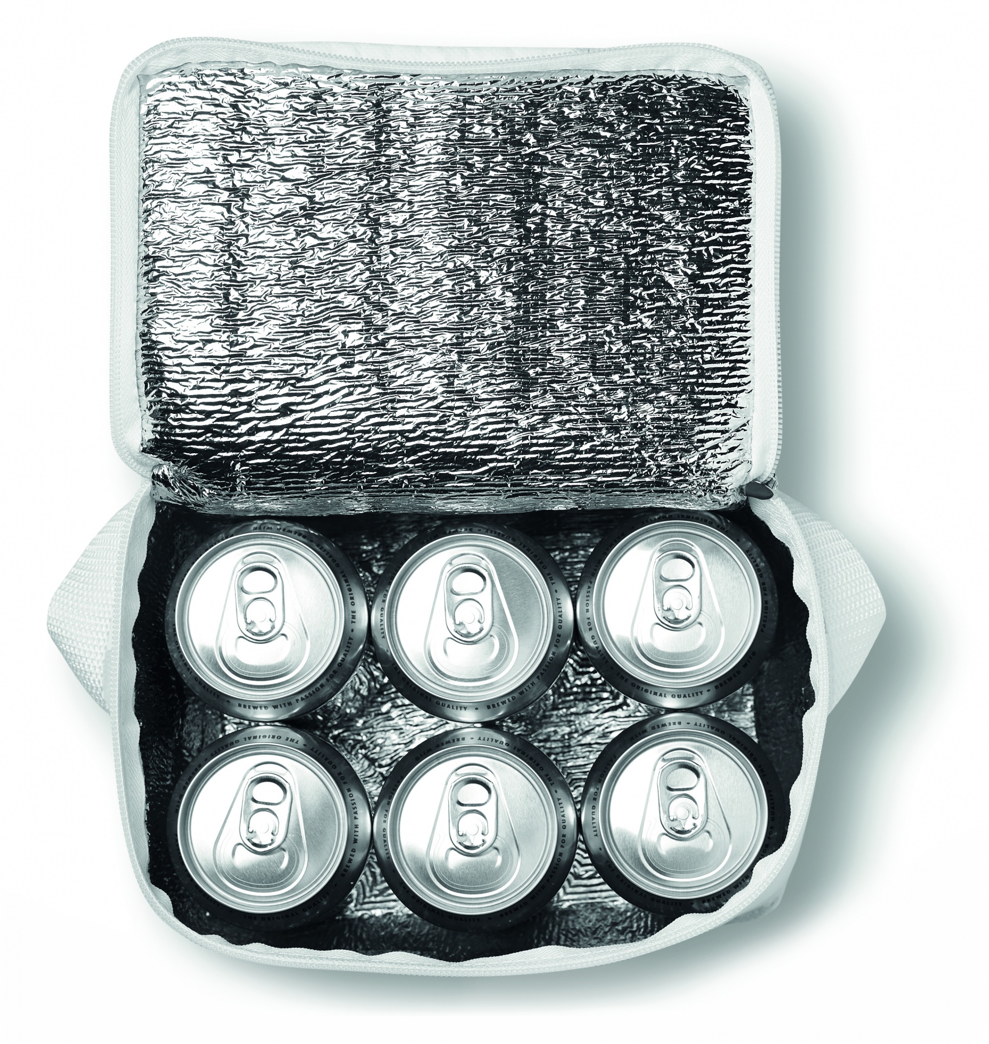 210 polyesterinen kylmälaukku 6 tölkille, kuitukangasta 80gr / m² sisäpuoli alumiinifoliolla päällystettyä vaahtomuovia.