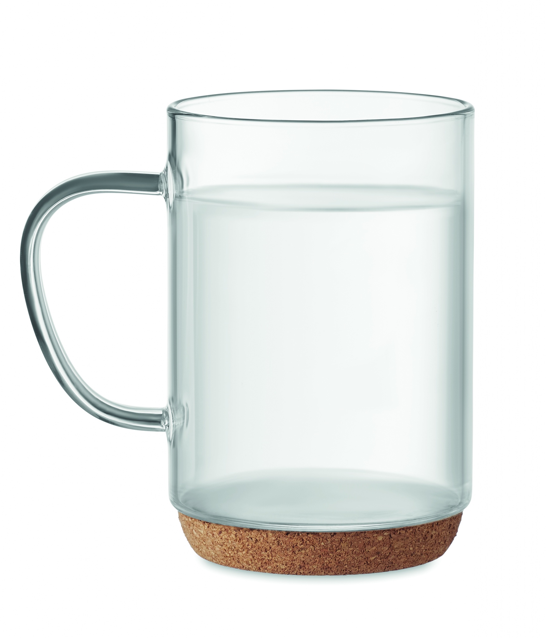 Borosilikaattilasista valmistettu 400 ml juomalasi korkki pohjalla. Borosilikaattilasiin ei voi kaiverruttaa.