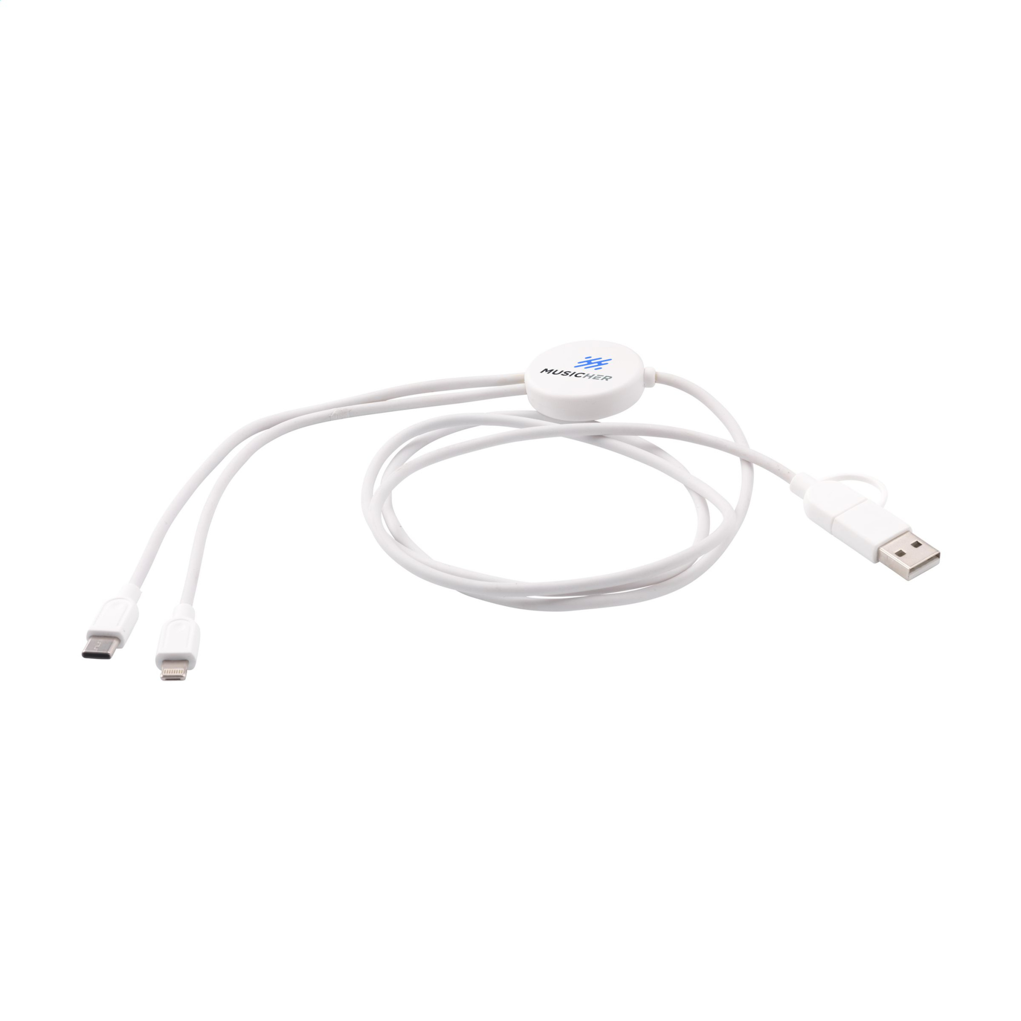 Kierrätetystä ABS:stä ja kierrätetystä TPE:stä valmistettu latauskaapeli. Tulo: Type-C ja USB-A-liitin. Lähtö: Type-C ja Lightning. RCS-sertifioitu. Kierrätysmateriaalia yhteensä: 62 %. Kaapelin pituus: 120 cm. Jokainen tuote toimitetaan erillisessä kirjekuoressa.