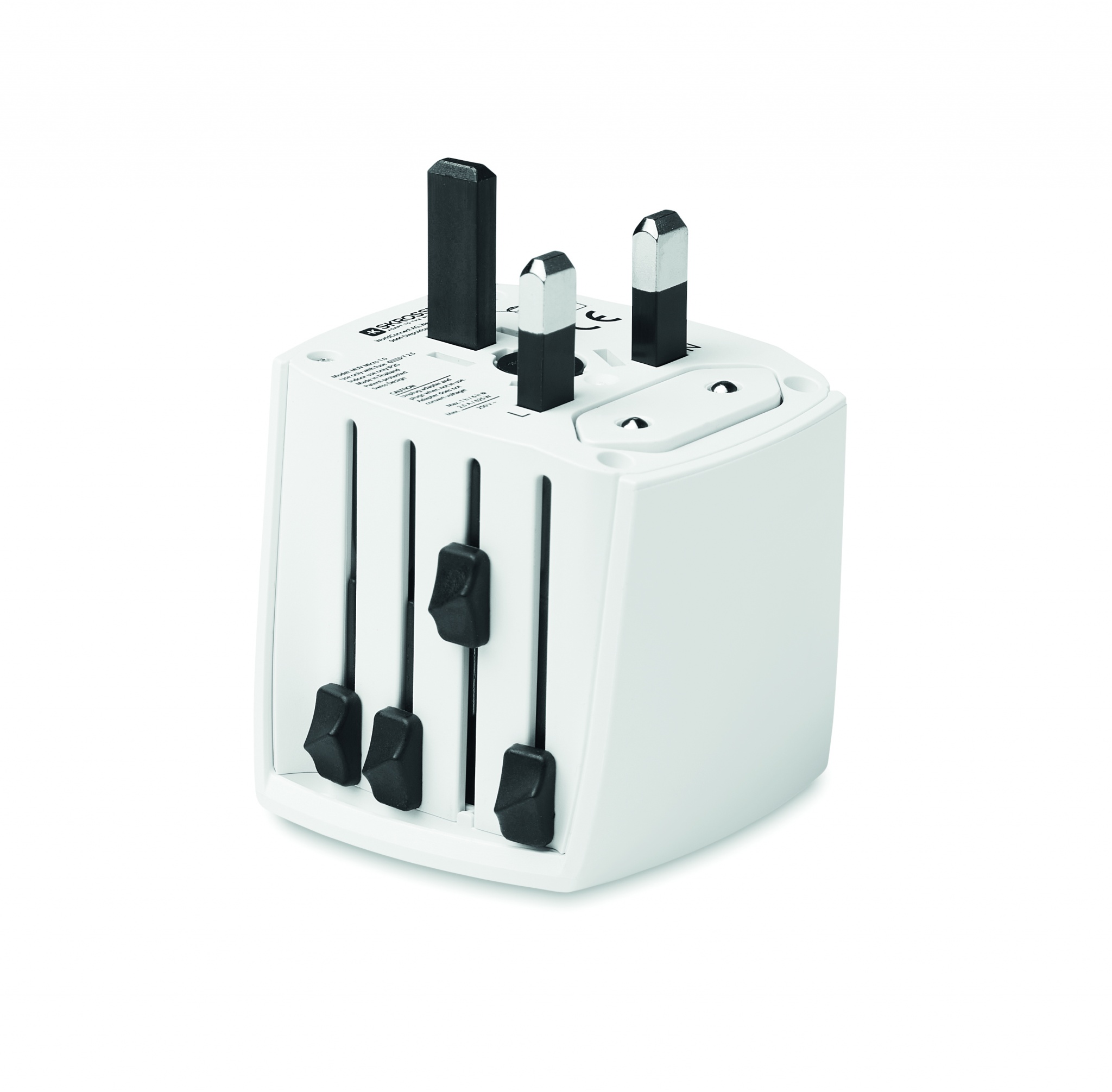 Universal SKROSS® -matka adapteri. Liittimet Eurooppaan, Yhdysvaltoihin / Japaniin, Australiaan / Kiinaan, ja 2-napainen, maadoittamaton liitin. Täyttää kaikki kansainväliset turvallisuuteen liittyvät standardit ja vaatimukset. Lapsi turvallinen.