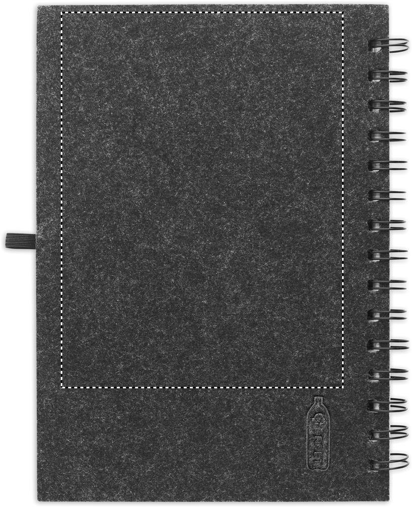 A5 RPET-huopakantinen muistikirja. Kierresidottu, 160 kierrätettyä viivoitettua sivua, 70 gr/m² (80 arkkia), joustava kynänpidike.