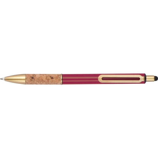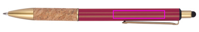 Metallinen kuulakärkikynä kullanvärisillä sovelluksilla, sinikirjoituksella täyttö ja korkkikahvavyöhyke. Logosi kaiverretaan leikkeen oikealle puolelle.