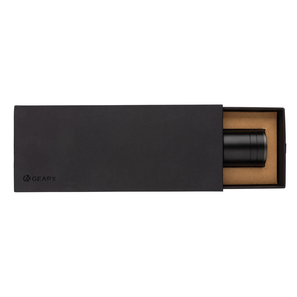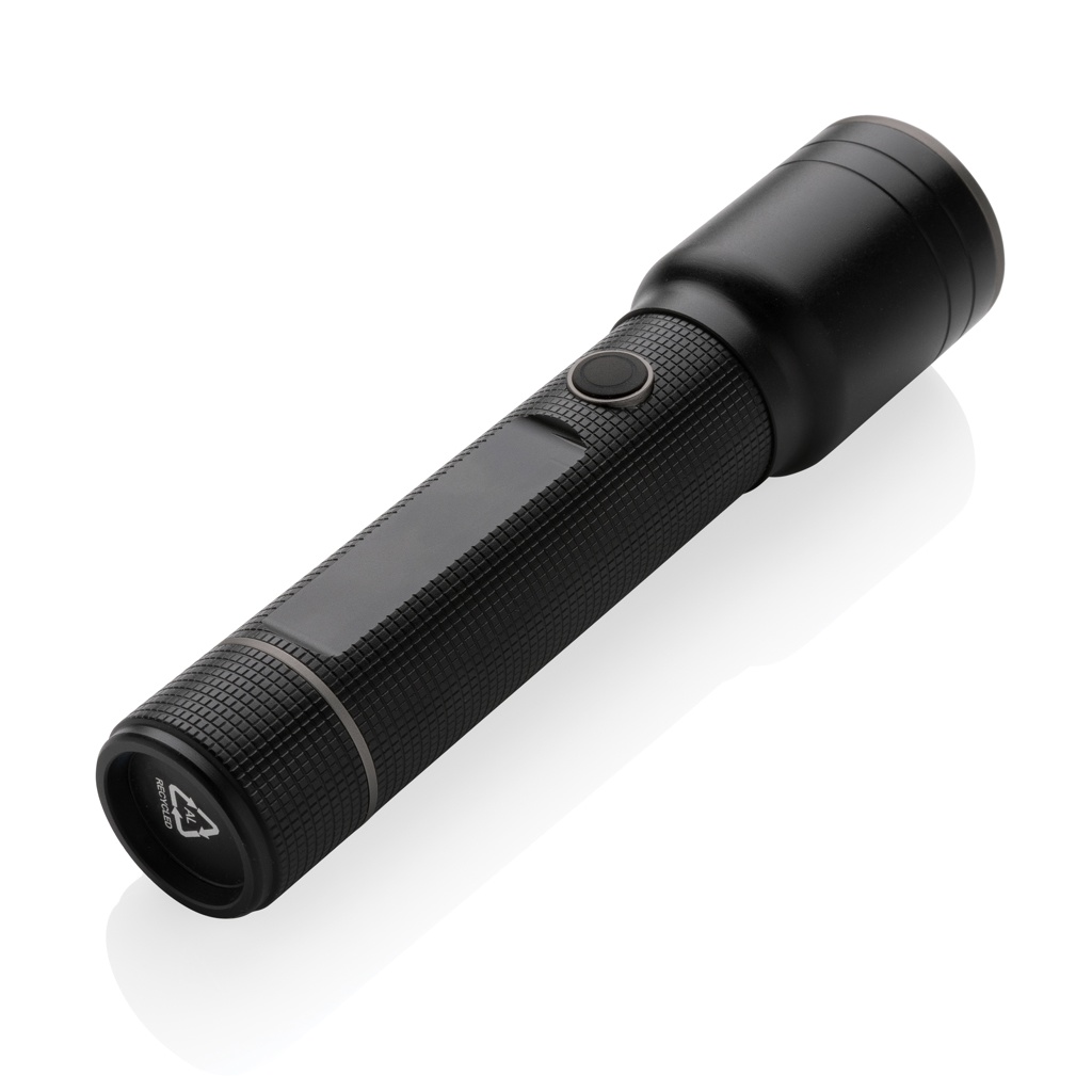Toiminnallisuus, suorituskyky ja muotoilu yhdistyvät tässä ladattavassa 10W taskulampussa, joka on valmistettu RCS-sertifioidusta kierrätysalumiinista. Kierrätetyn materiaalin kokonaismäärä: 20% tuotteen kokonaispainosta. RCS-sertifiointi takaa kierrätysmateriaalien täysin sertifioidun toimitusketjun. IP4-luokituksensa ansiosta se on säänkestävä ja sopii erinomaisesti ulkokäyttöön. Tehokas polttimo luo jopa 1500 lumenia ja valokeilan kantama on jopa 800 metriä. Taskulamppu käyttää ladattavaa A-luokan akkua. Lataus on helppoa USB-liitännän kautta ja mukana tulevalla RCS-sertifioidulla kierrätetyllä tyypin C -kaapelilla. Korkealaatuisessa polttimossa on 5 toimintoa, mukaan lukien SOS-toiminto. 4000 mAh akku mahdollistaa jopa 10 tunnin käytön yhdellä latauksella. Alumiini ei menetä ominaisuuksiaan kierrätysprosessissa ja sitä voidaan kierrättää loputtomasti. Tuote ja tarvikkeet ovat 100% PVC-vapaita. Pakattu FSC-mix pakkaukseen. Syöttö Type-C 5V, 1A; Lähtö 5V, 1A