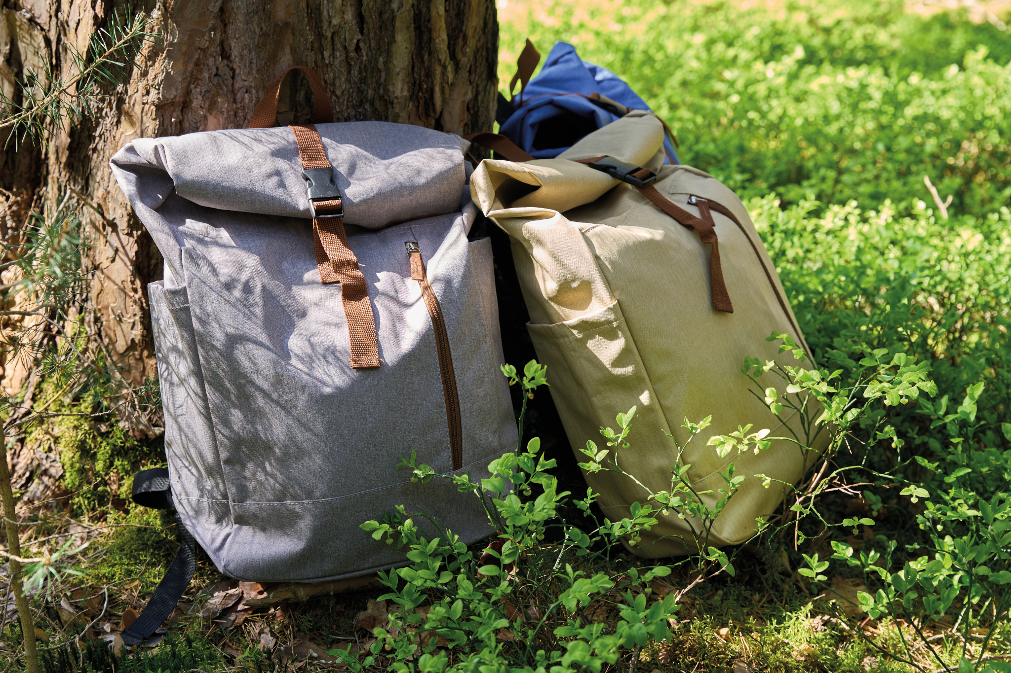 Reppu 500D polyesterista, taitettava tai rullattava suljin, pehmustetut olkaimet, kantokahva ja lukittava etutasku. Logosi painetaan etulokeroon.
