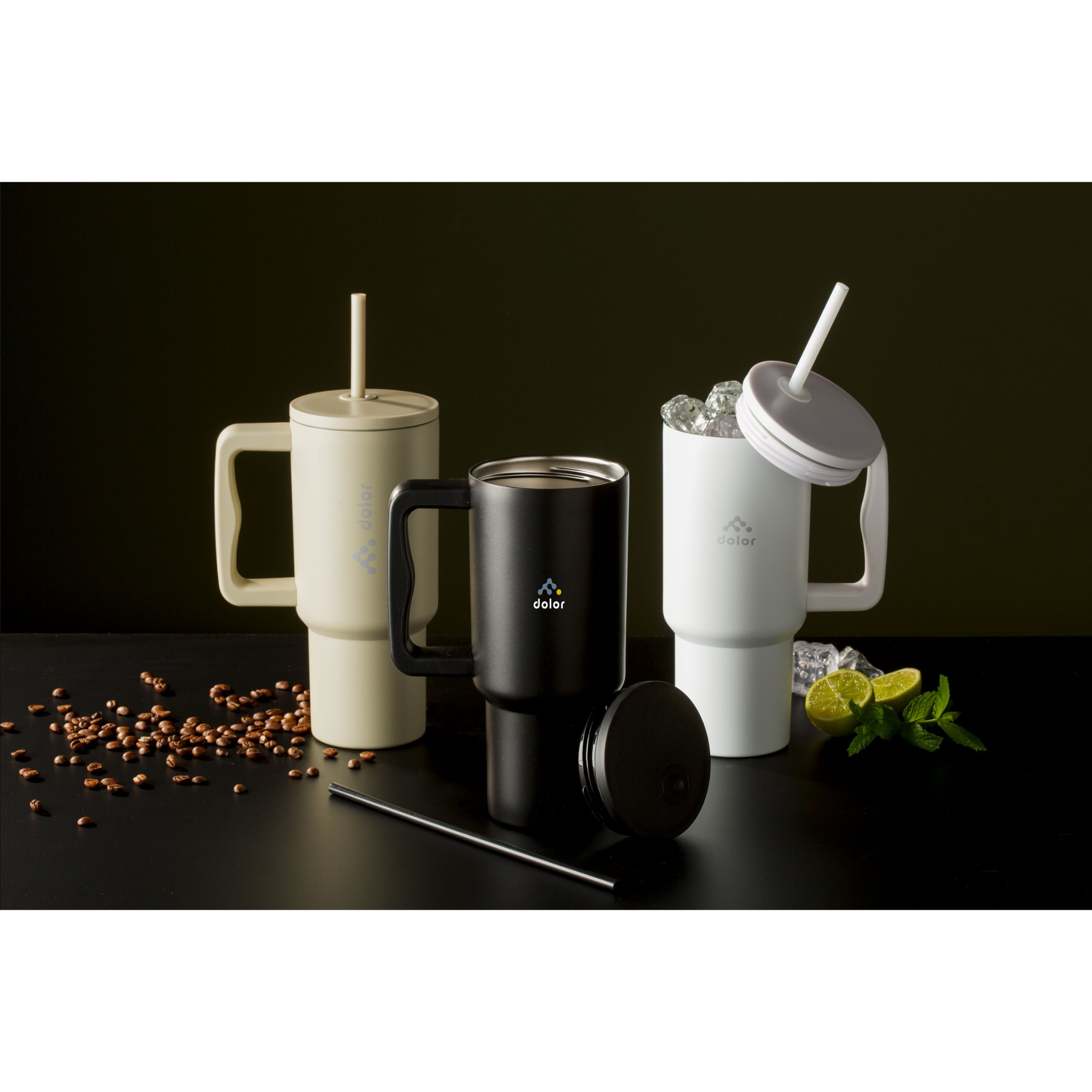 Vau! Suuri, kaksiseinäinen juomakuppi, joka on valmistettu kierrätetystä ruostumattomasta teräksestä oljella. Näyttävässä, tukevassa mukissa on iso muovikahva ja kierrettävä kansi, jossa on aukko mukana tulevalle muovipillille. Tämä valtava muki pitää juomat lämpimässä pidempään. Sopii kylmille ja kuumille juomille. Ilman pilliä lämpötila ei häviä kannen silikonitiivisteen ansiosta. Tämä muki voi mennä minne tahansa. Ihanteellinen kuntosalille tai toimistoon. Kartiomaisen, kapean pohjan ansiosta kuppi sopii melkein mihin tahansa mukinpidikkeeseen, joten se sopii täydellisesti tien päällä. Ei astianpesukoneen kestävä. RCS-sertifioitu. Kierrätysmateriaali yhteensä: 75 %. Tilavuus 900 ml. Jokainen tuote toimitetaan erillisessä ruskeassa pahvilaatikossa.