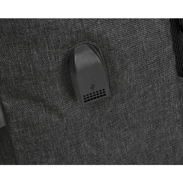 rPET-reppu, jossa USB-portti, pehmustetut olkaimet, lokero kannettavalle tietokoneelle, etutasku ja varkaudenestoosasto. Painamme logosi etuosastoon.