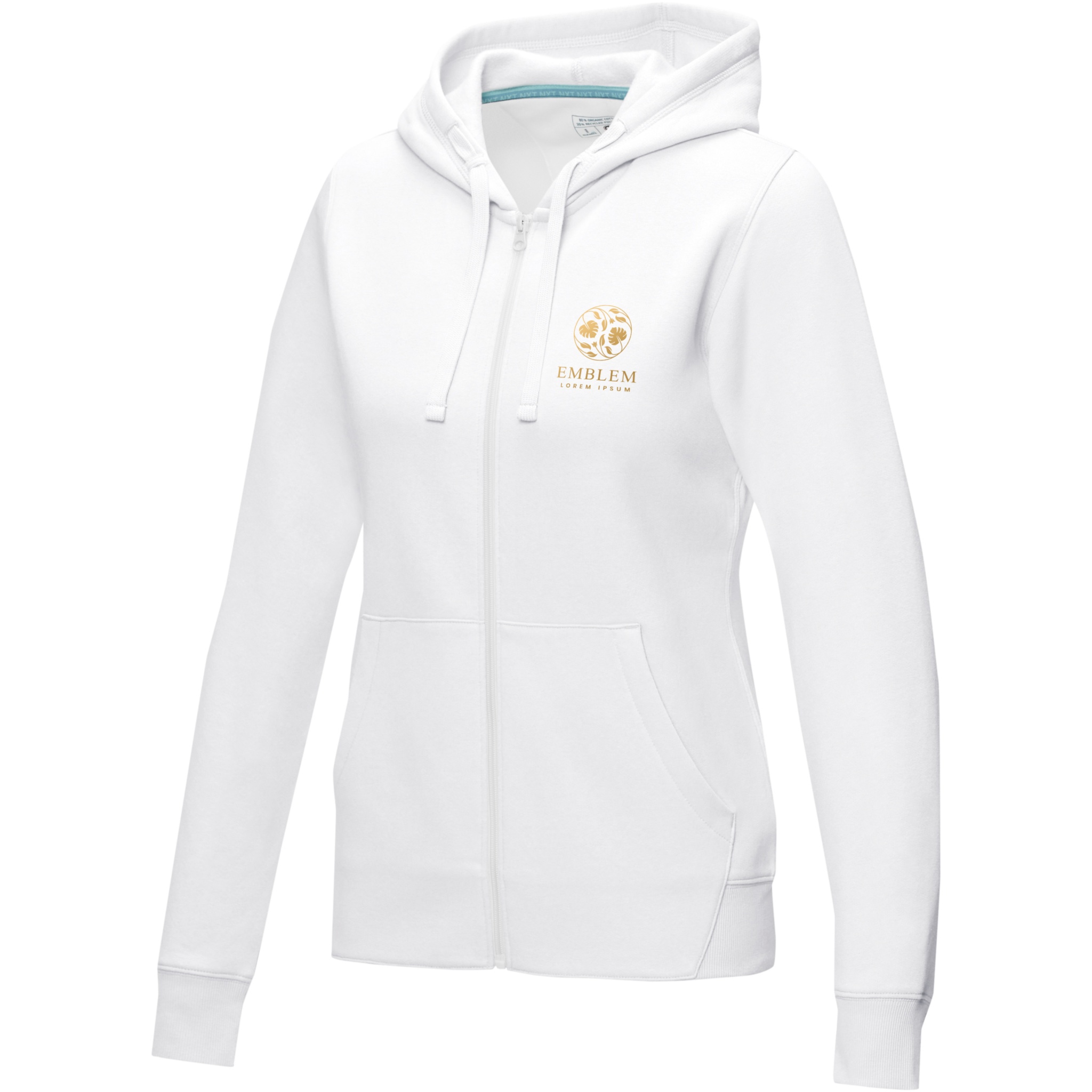 The Ruby women's organic recycled full zip hoodie – this hoodie showcases a blend of eco-conscious features that redefine modern fashion. With a soft brushed interior, it ensures a cozy feel. Made from a 280 g/m² blend of organic cotton and recycled polyester. This hoodie is designed with a fitted shape for a feminine look.