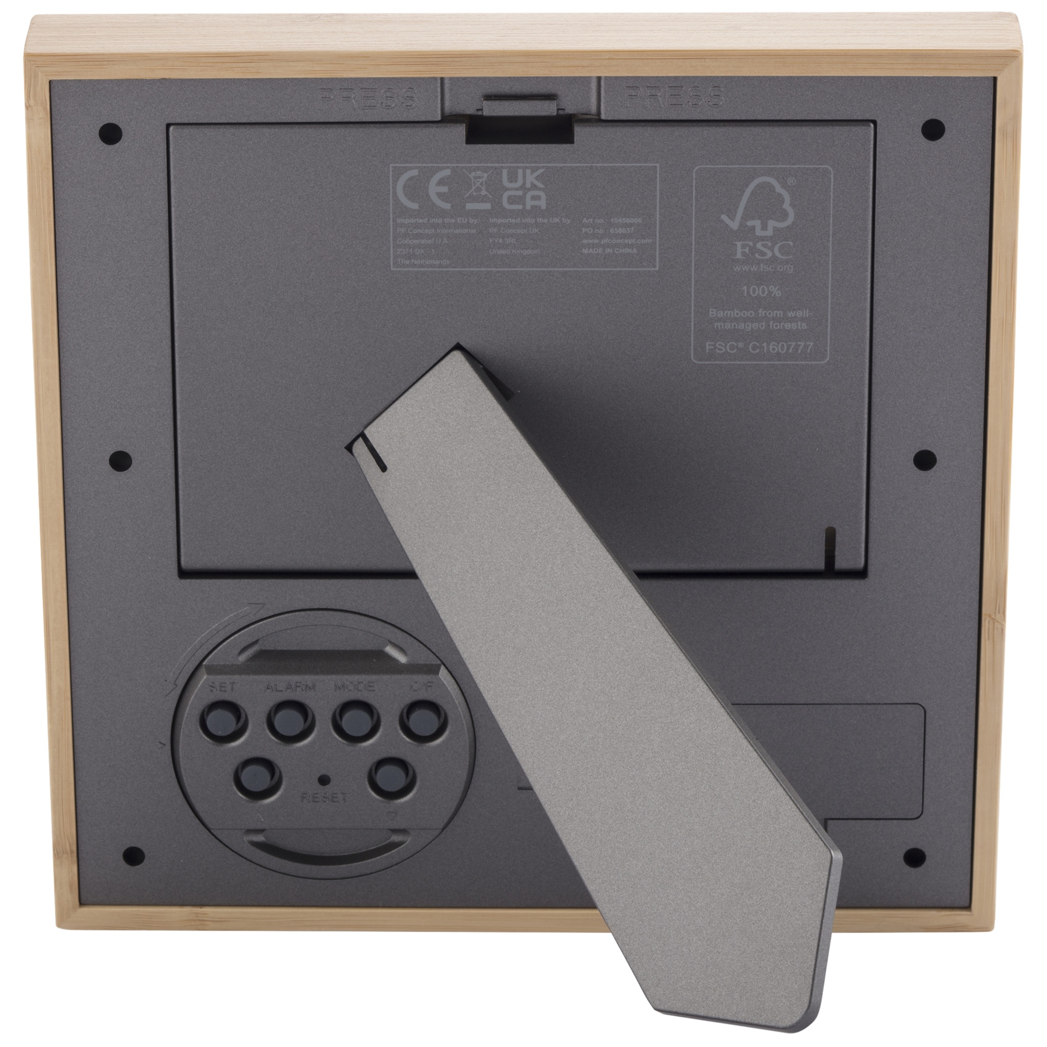 Sasa-bambuvalokuvakehys on tyylikäs ja toimiva lisä kotiisi tai toimistoosi. Valokuvakehyksen kuori on vastuullisesti hankittua bambua ja takaosa kierrätysmuovia. Kehys on elegantti edistäen samalla vastuullisuutta. Kehyksessä on LCD lasi joka takaa tarkan näytön. Näyttää normaaliasetuksilla ajan, kuukauden, päivämäärän, viikonpäivän ja lämpötilan. Valokuvakehyksen koko 127 x 89 mm. Tuotteessa on myös herätys- ja torkkutoiminto, joka auttaa aloittamaan päiväsi ajoissa. Syntymäpäivämuistutustilassa voit seurata tärkeitä päivämääriä, kun taas ajastintila sopii täydellisesti tehtävien tai aktiviteettien ajoitukseen. Lisäksi musiikkitilassa voit nauttia jopa seitsemästä valinnaisesta kappaleesta. Sisältää 2 AA-paristoa. Toimitetaan voimapaperista valmistetussa lahjapakkauksessa käyttöohjeineen.