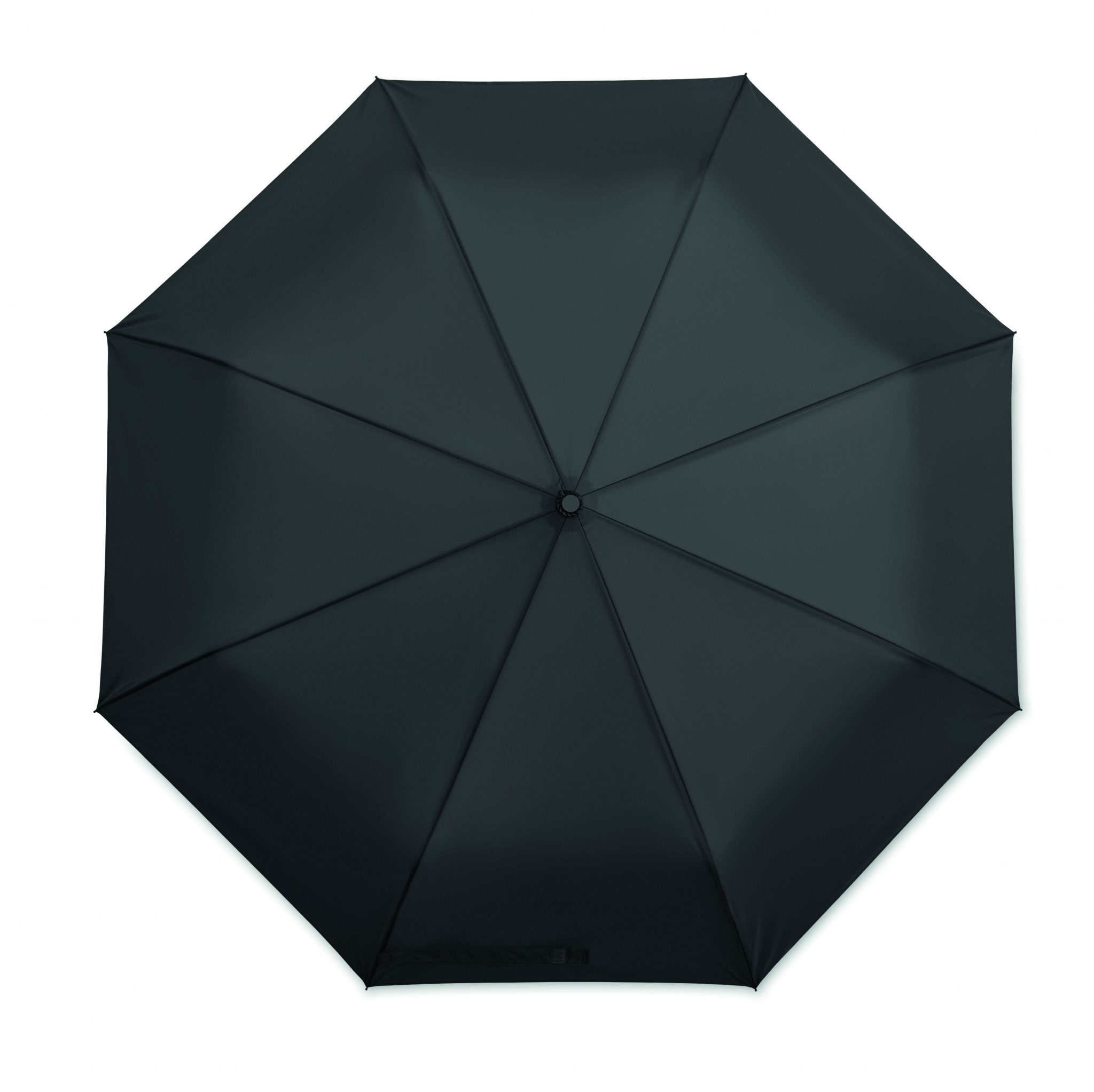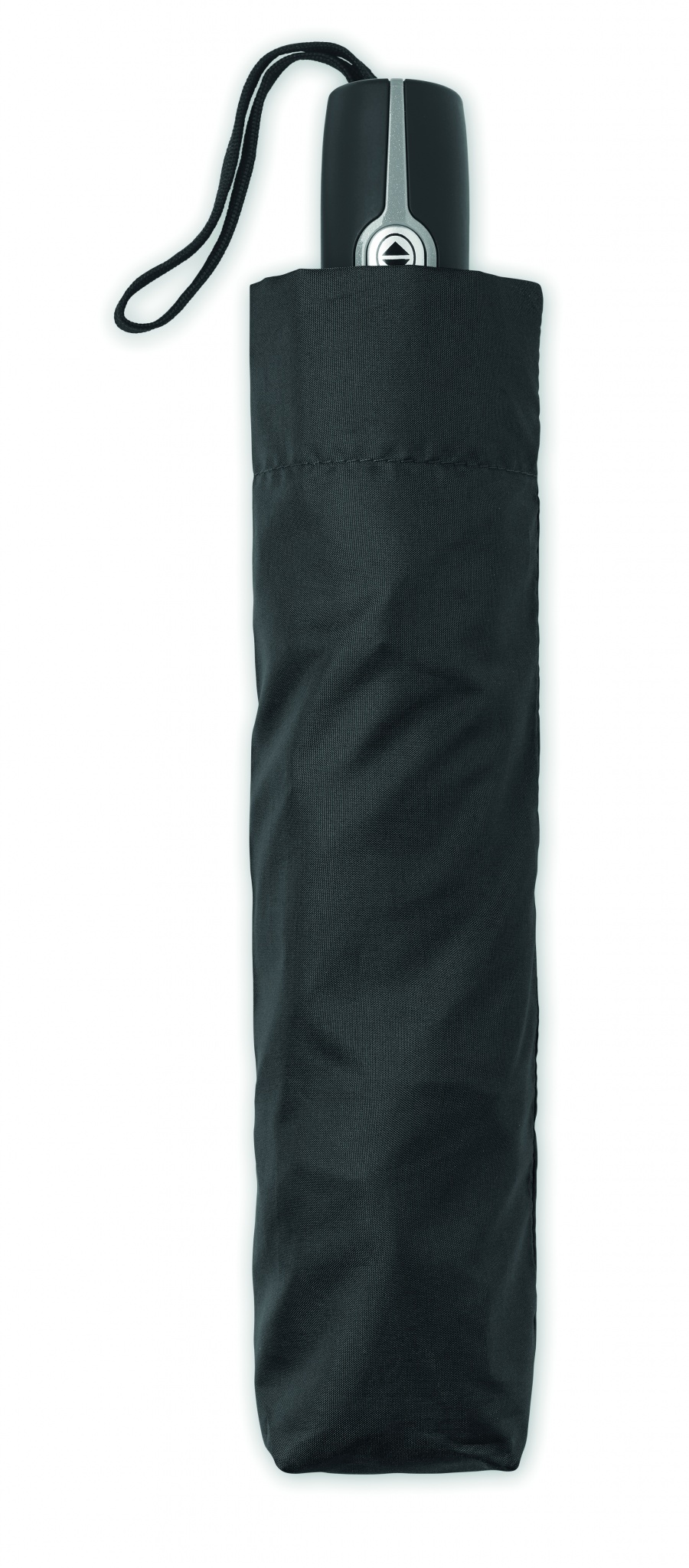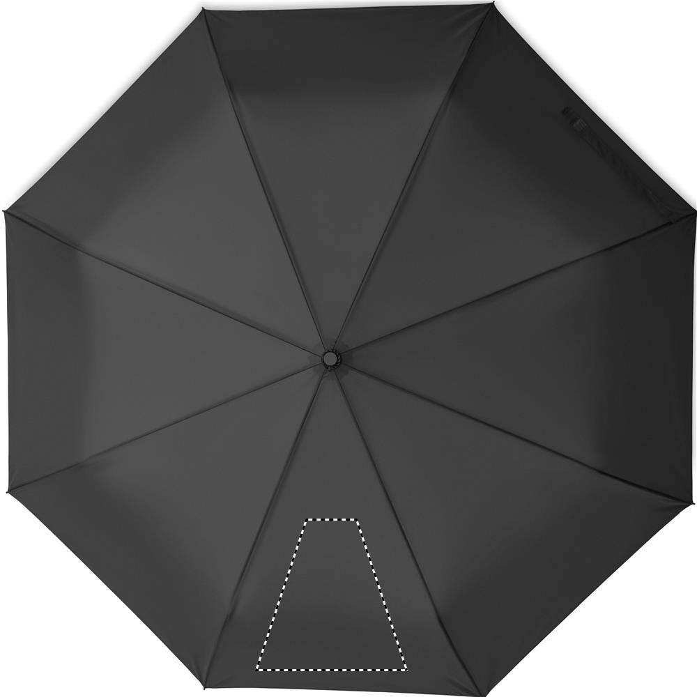 27 tuuman kolmeen osaan taittuva automaattisesti avautuva/sulkeutuva tuulenkestävä sateenvarjo. 190T pongee-materiaalista valmistettu varjo jossa on musta pinnoitettu teräsvarsi, lasikuituruoteet ja musta PP-kahva painikkeella. Suojapussi.