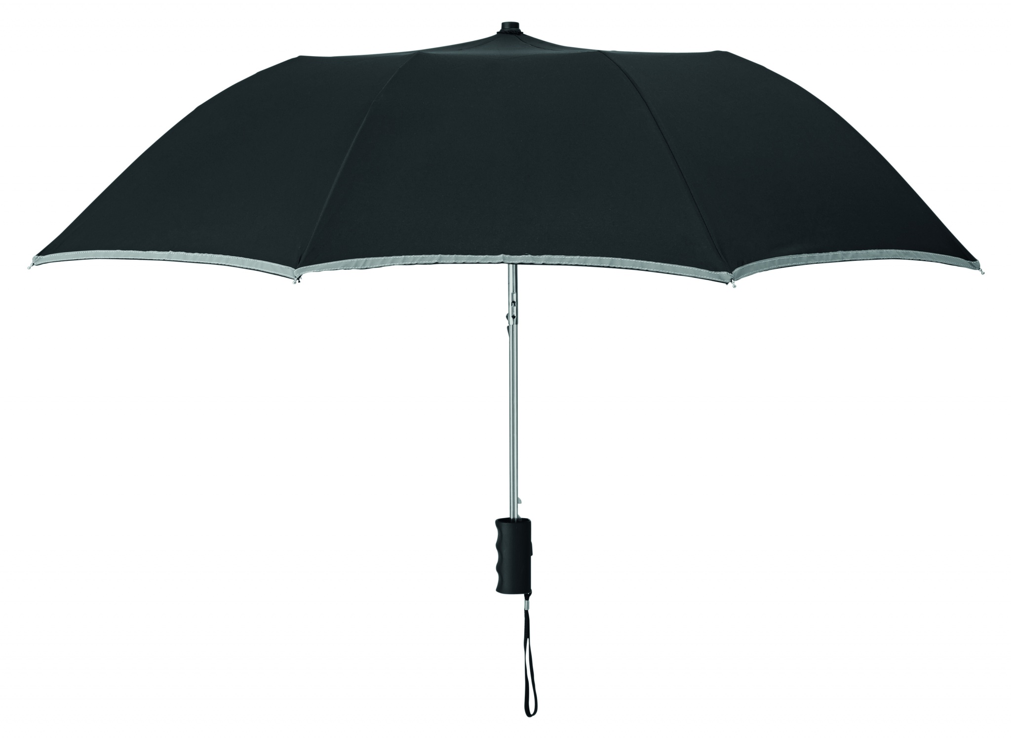 190T-pongee 2 osainen 21 tuuman sateenvarjo, automaattiavauksella. Sinkillä pinnoitetut teräsvaris, ruoteet ja kärki. Paneelien reunat heijastavalla verhoilulla, musta muovikahva rannehihnalla. Sisältää saman värisen säilytyspussin, manuaalinen suljin.