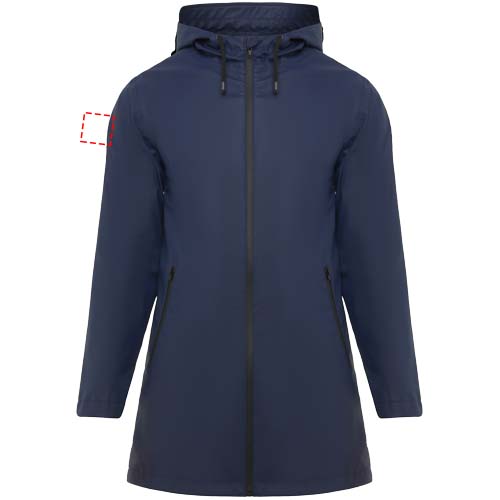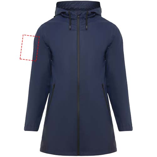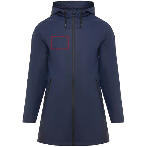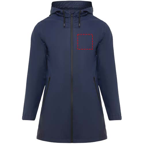 Vedenpitävä naisten sadetakki. Lipallinen huppu. Lämpösaumatut vetoketjut ja saumat. Mustat kontrastiväriset yksityiskohdat. Kaksi sivutaskua vetoketjuilla. Takaosan helmassa halkio. Irrotettava tuoetemerkki. Vedenpitävä. Kuvan malli on 179 cm pitkä ja hänellä on päällään koko S.