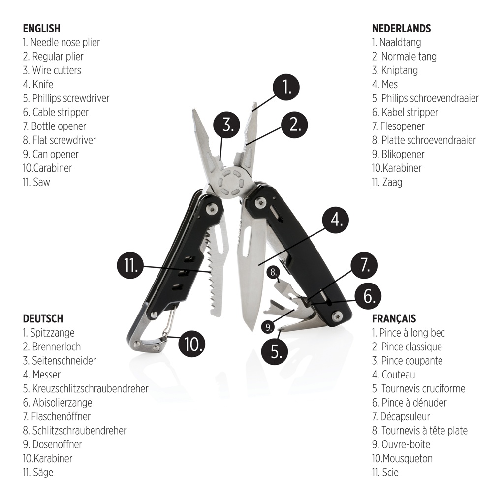 Vahva ja kestävä yleistyökalu, jossa 11 toimintoa. Alumiinikotelo ja ruostumattomat terästyökalut. Työkaluihin kuuluvat: nokkapihdit, tavalliset pihdit, veitsi, ristipäämeisseli, talttapäämeisseli, saha, tölkinavaaja, pullonavaaja, katkaisupihdit, karbiinihaka. Pakattu lahjapakkaukseen.