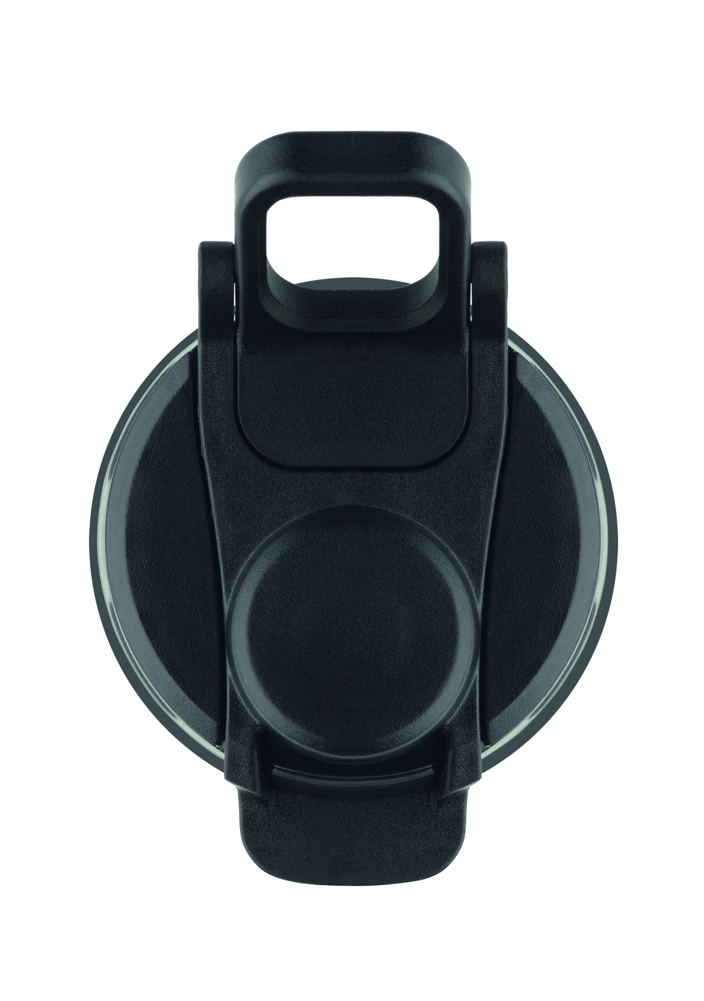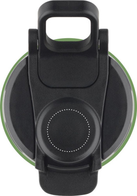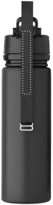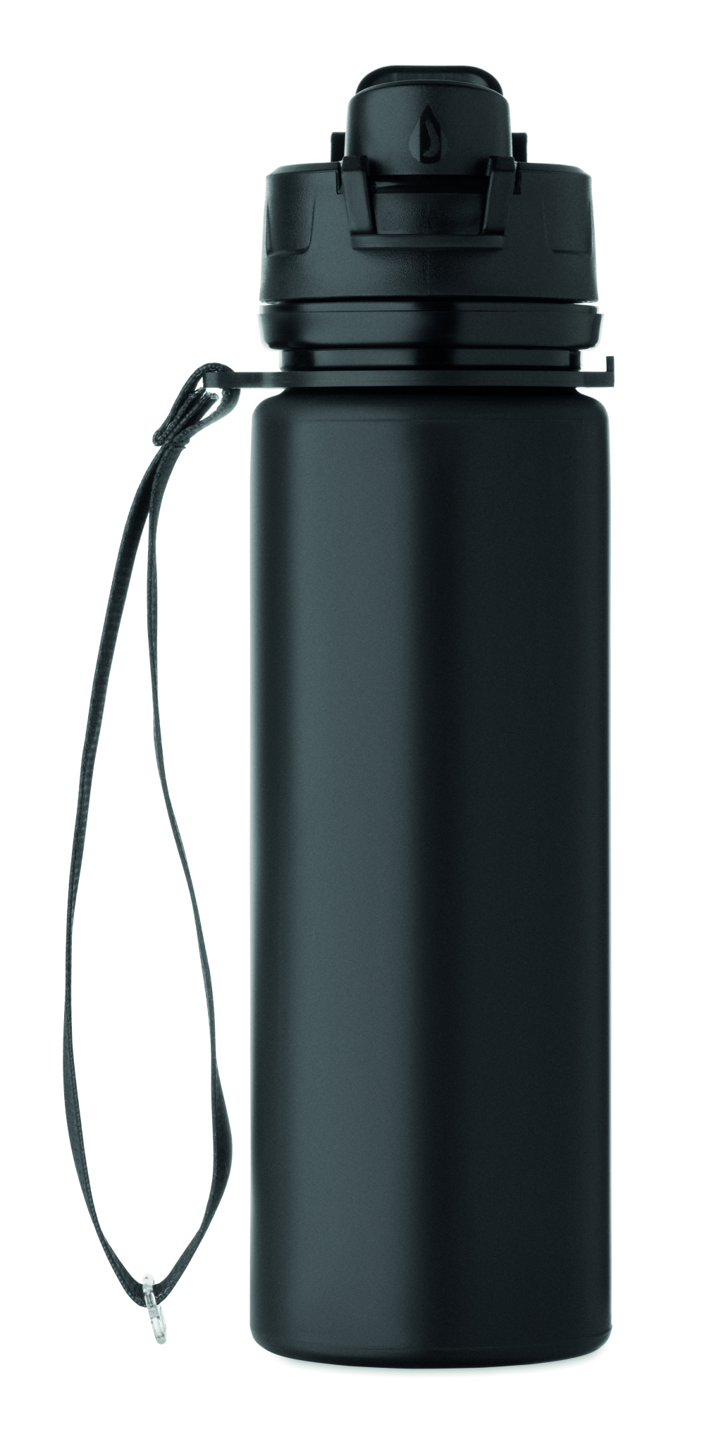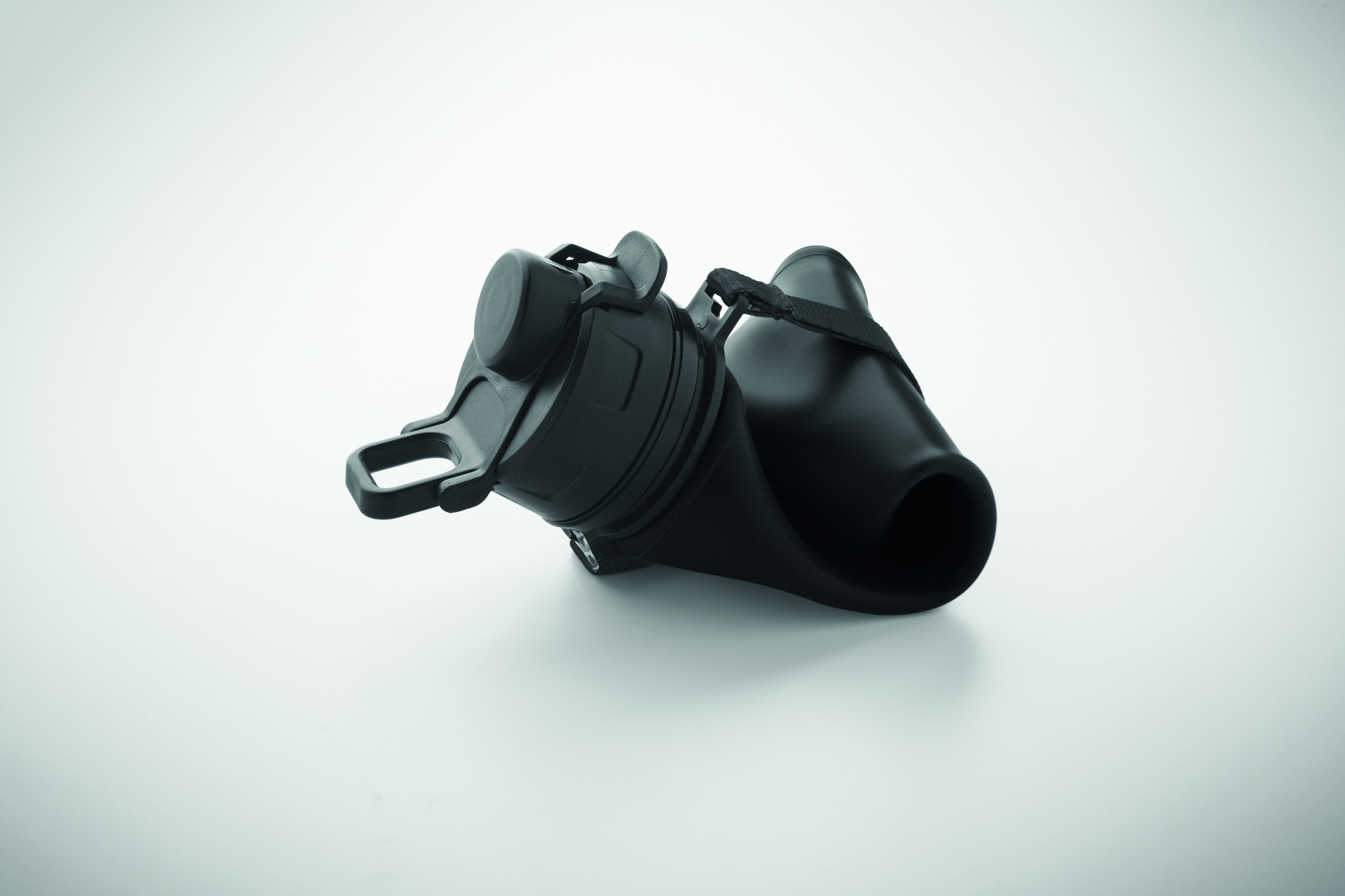 Kokoontaitettava silikoniurheilupullo, jossa on PP-kansi, kahva, polyesterihihna ja läpinäkyvä solki, joka kiinnittää pullon kokoontaitettuna. Vuotamaton. Tilavuus 500 ml.