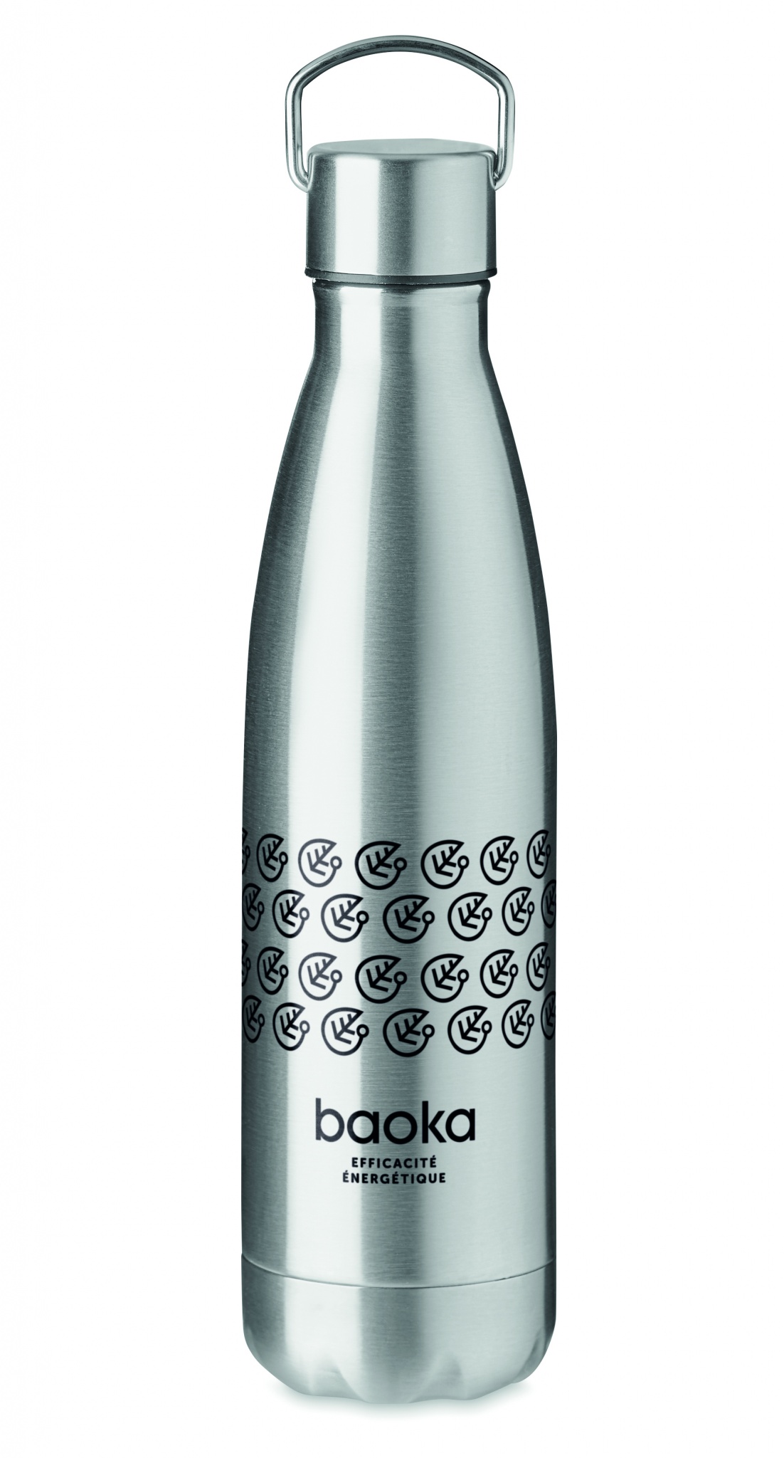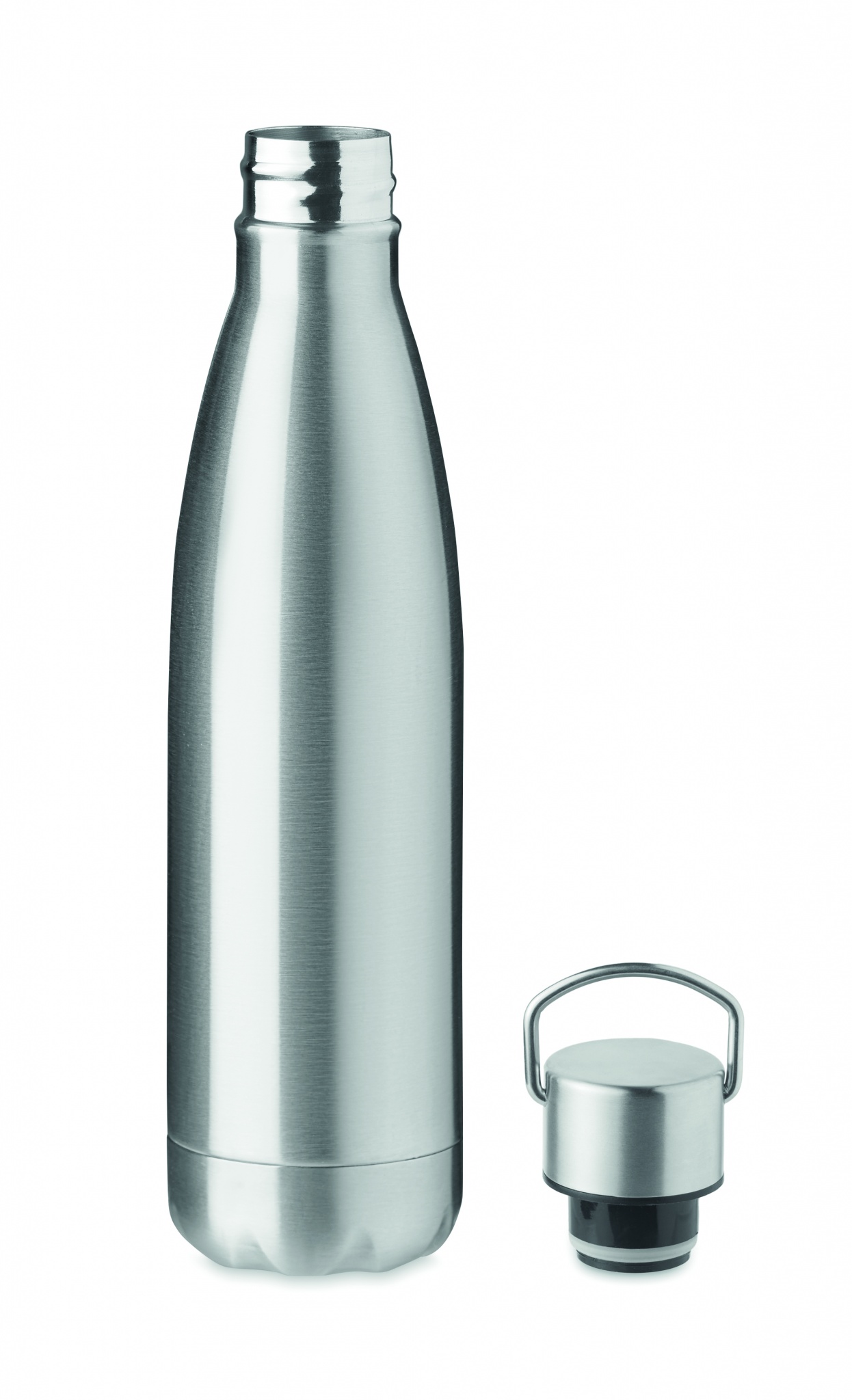 Kaksiseinäinen ruostumattomasta teräksestä valmistettu termospullo, jossa on kahvallinen korkki. Tilavuus 500 ml. Vuotamaton.
