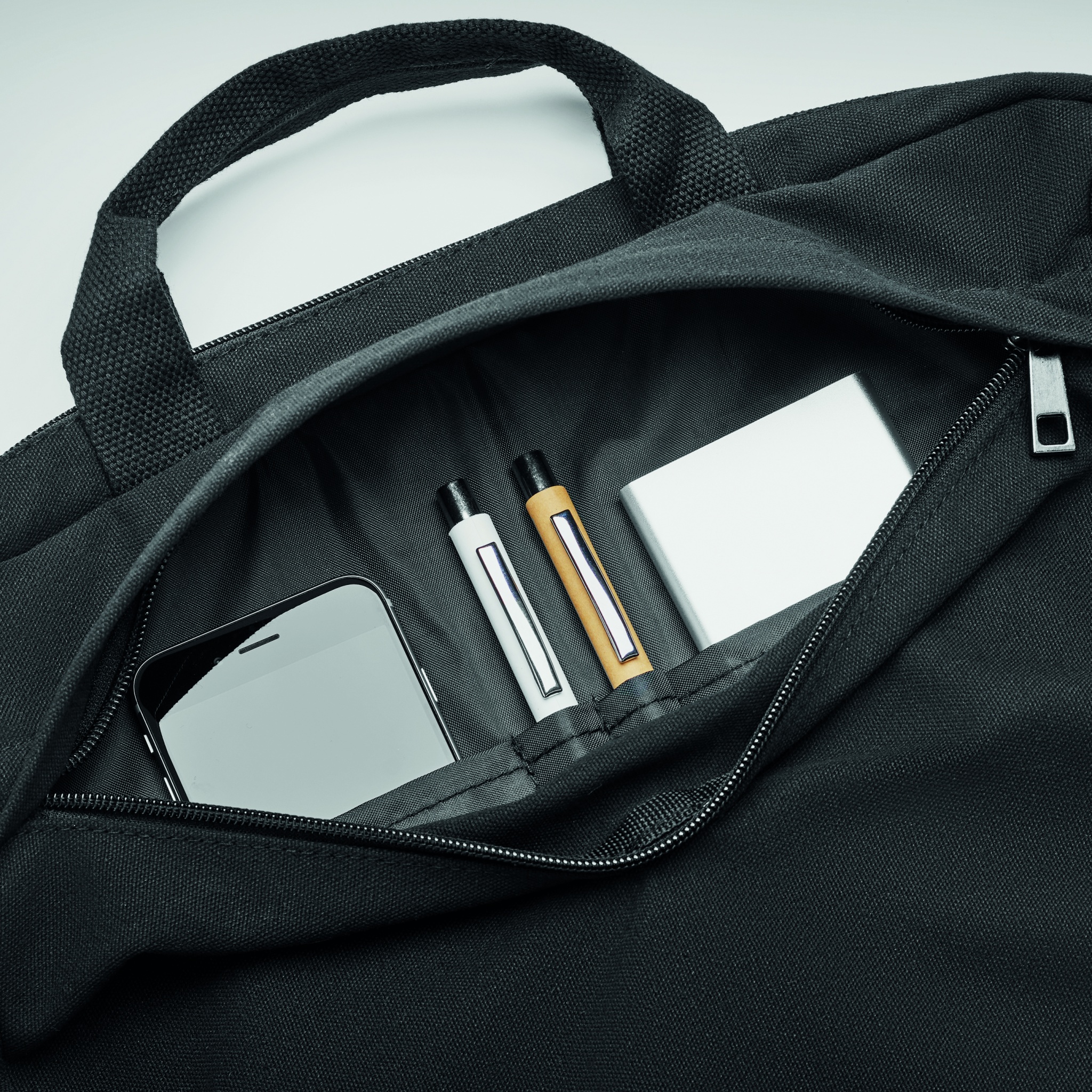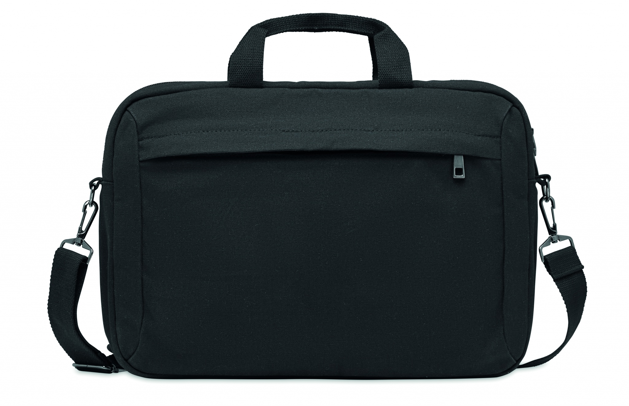 Tietokonelaukku 340 gr/m² pestyä canvaskangasta . Pehmustettu irrotettava ja säädettävä olkahihna. Selkäpuolella hihna, josta laukun saa kätevästi vetolaukun kahvaan kiinni.