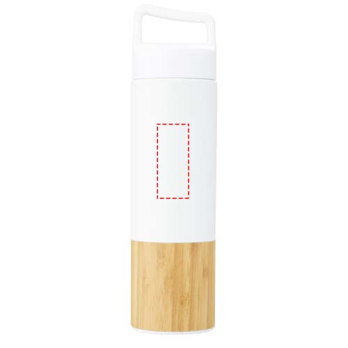 Kupariyhjiöeristetty, 18/8 ruostumattomasta teräksestä valmistettu pullo, joka pitää juomat kuumina tai kylminä useita tunteja. Siinä on trendikkäitä bambudetaljeja, ja kannen päällä oleva kahva helpottaa mukana kuljettamista. Pullossa on leveä aukko, josta se on helppo täyttää ja puhdistaa. Testattu ja hyväksytty elintarviketurvallisuslainsäädännön (LFGB) mukaisesti, ja ftalaattipitoisuus on testattu REACH-asetusten mukaisesti. Tilavuus on 540 ml. Toimitetaan kierrätetystä kartongista valmistetussa lahjapakkauksessa.