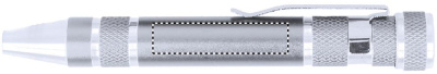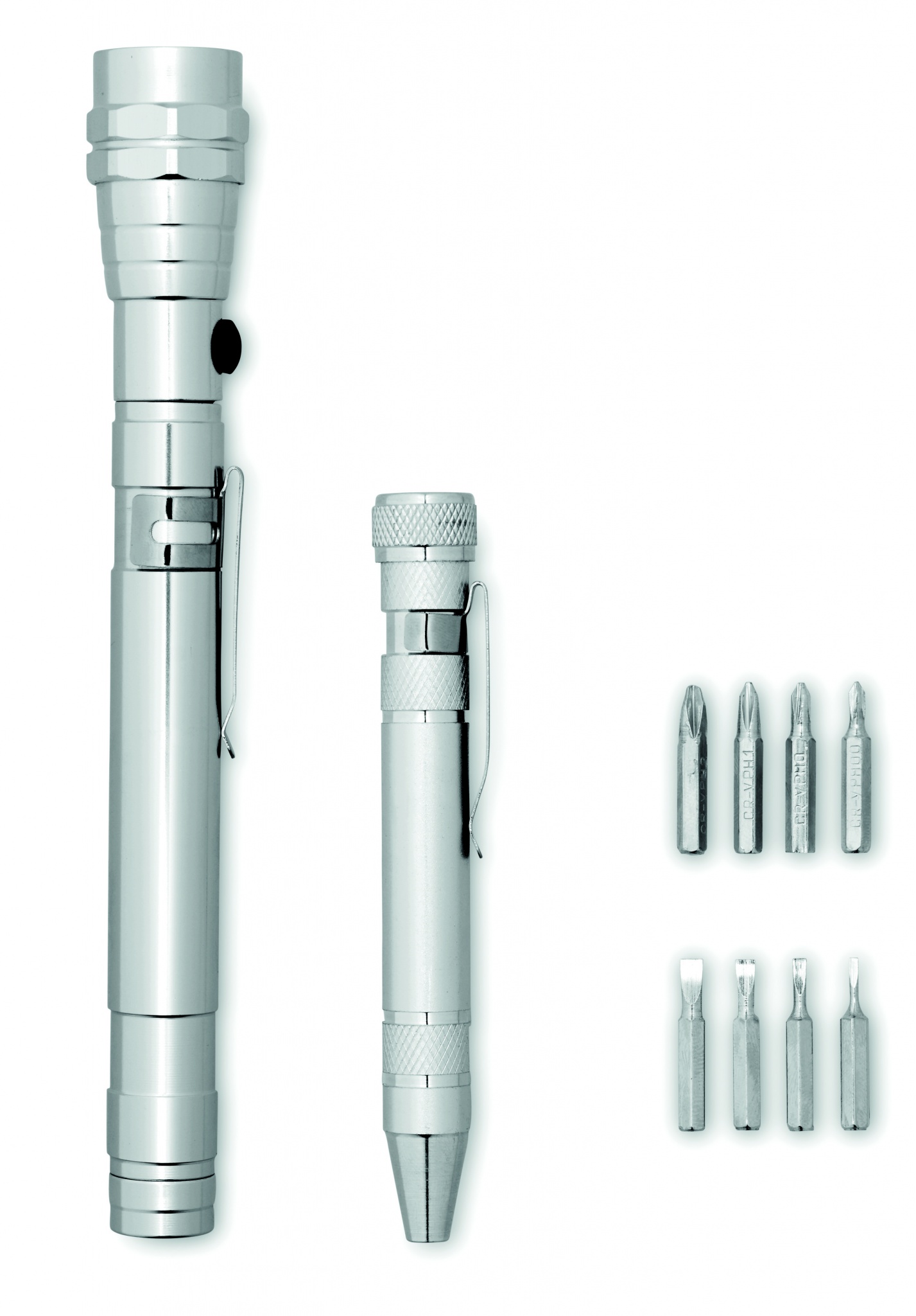 Työkalusarja aluuminisella jatkettavalla 3 LED- valoisella taskulampulla, sisältää 4 taltta- ja 4 Philipsin risti ruuvimeisseli päätä. Pakattuna lahjalaatikkoon, sisältää 4 LR44 paristoa.