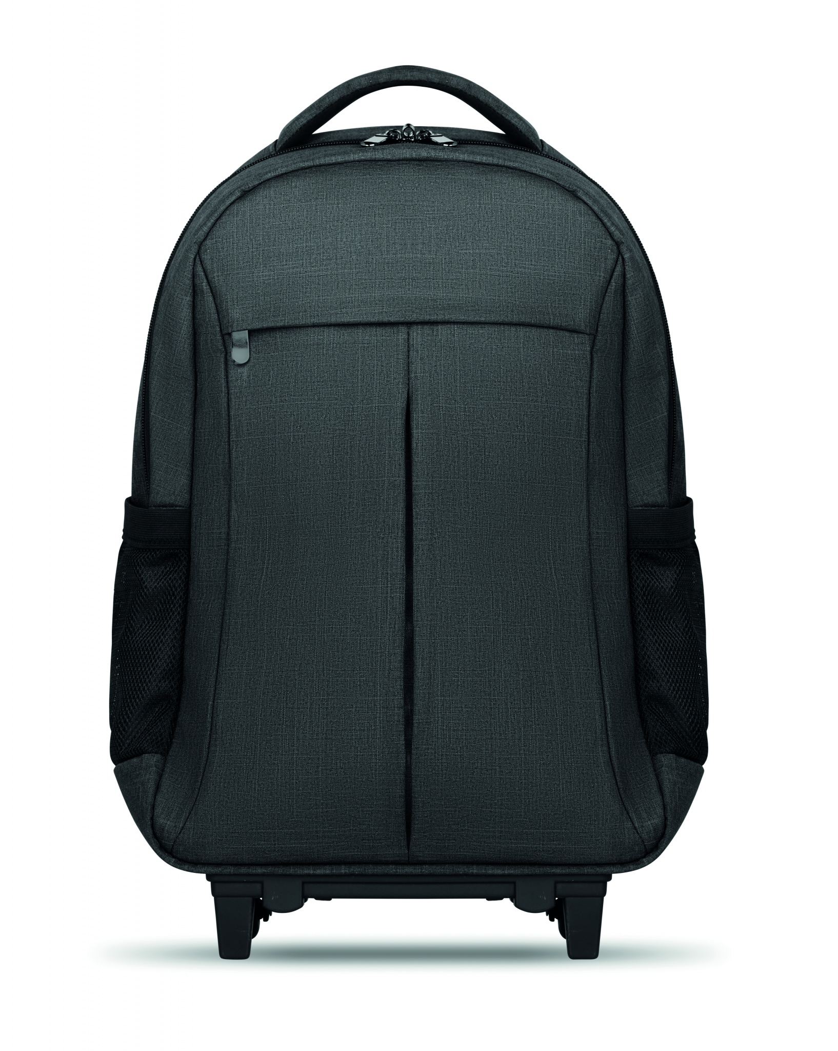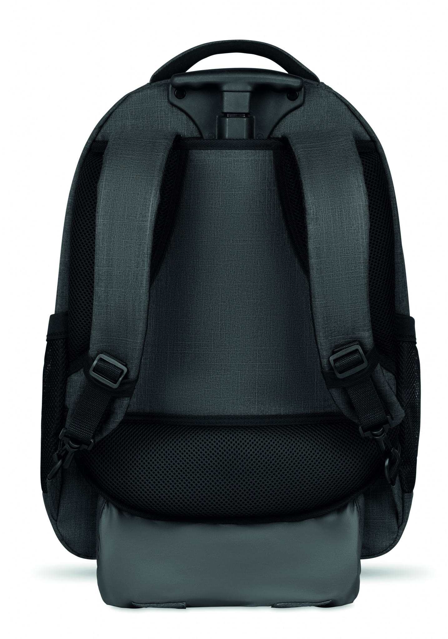 360D- polyesterinen vetolaukkureppu, sisältää 15 tuuman kannettavan tietokoneen lokeron, vetoketjutaskun edessä ja tabletille oman lokeron. Pehmustetut selkä- ja olkahihnat, sisäänrakennettu hiha suojaa pyöriä kannettaessa selässä.