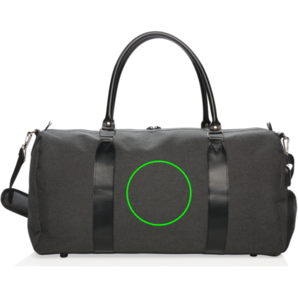 Moderni ja minimalistinen 600D polyesterinen viikonloppulaukku PU kahvoilla ja mukavalla olkahihnalla. Suuri pääosasto, jossa tilaa kaikille tavaroille viikonlopun viettoa varten. Yhdistä varavirtalähteesi helposti integroituun USB A-latausporttiin ja lataa puhelimesi tai tablettisi matkan aikana. Tuotteen oikealla puolella kätevä tasku. PVC-vapaa.