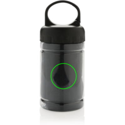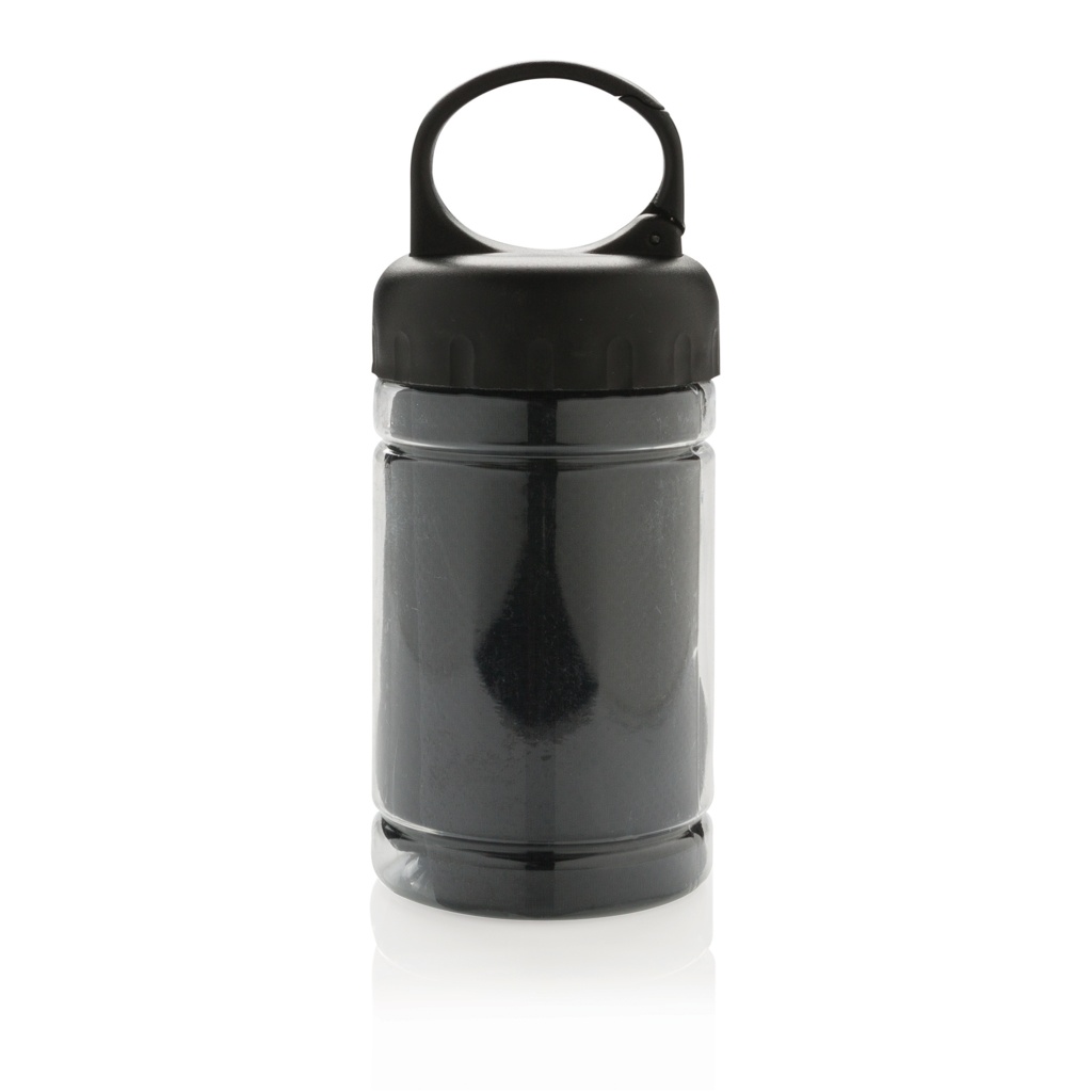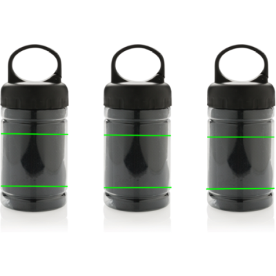Mikrokuituinen viilennyspyyhe 100% vapaa kemikaaleista. 98% auringonesto ominaisuus UV50+ suojauksella. Pyyhettä käytetään lisäämällä kylmää vettä pulloon, mikä luo kylmän pyyhkeen nopeaa virkistystä varten. Pullo PP-materiaalia ja yläosa ABS-materiaalia, mukana myös ripustinkoukku. 77 x 30cm.