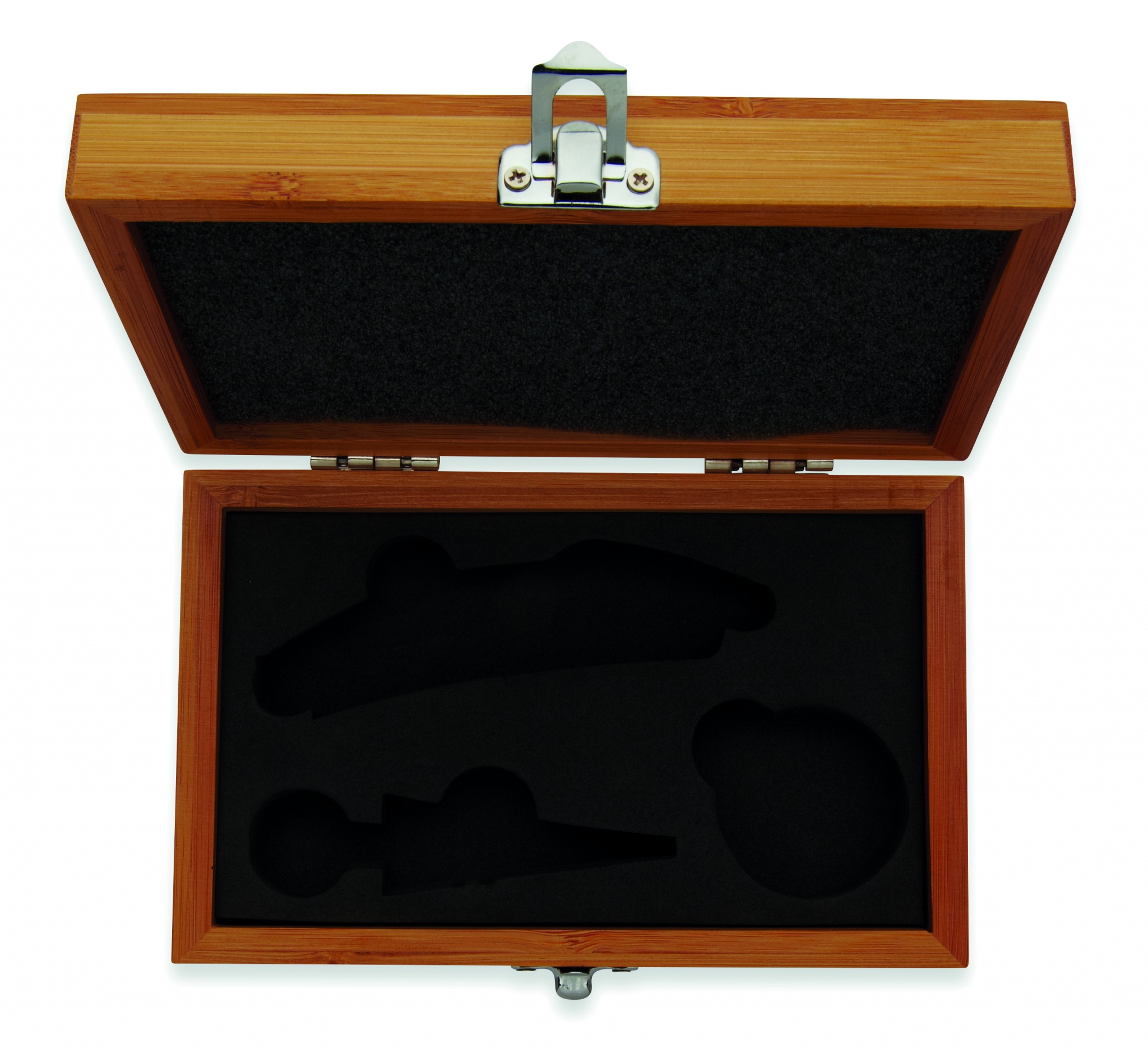 Viinisetti bambupakkauksessa sisältää korkkiruuvin, viinikauluksen ja viinikorkin, ruostumattomasta teräksestä ja bambusta. Bambu on luonnollinen materiaali, tuotteen värissä ja koossa voi olla pieniä eroja, saattaa vaikuttaa personalisoinnin lopputulokseen.