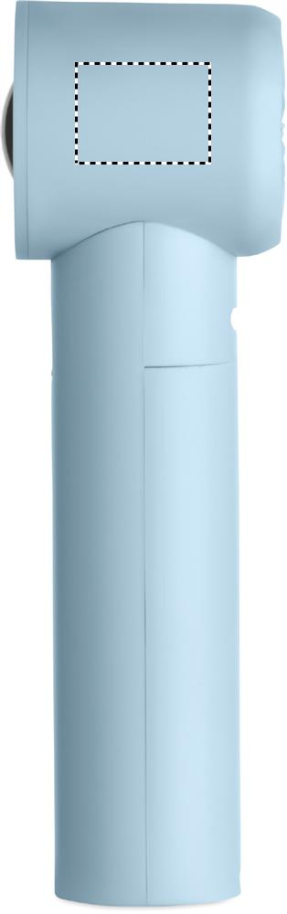 Mini rankinis ventiliatorius iš ABS plastiko su ekranu ir 5 greičio nustatymais. Pridedama keičiama 2600 mAh įkraunama ličio baterija.