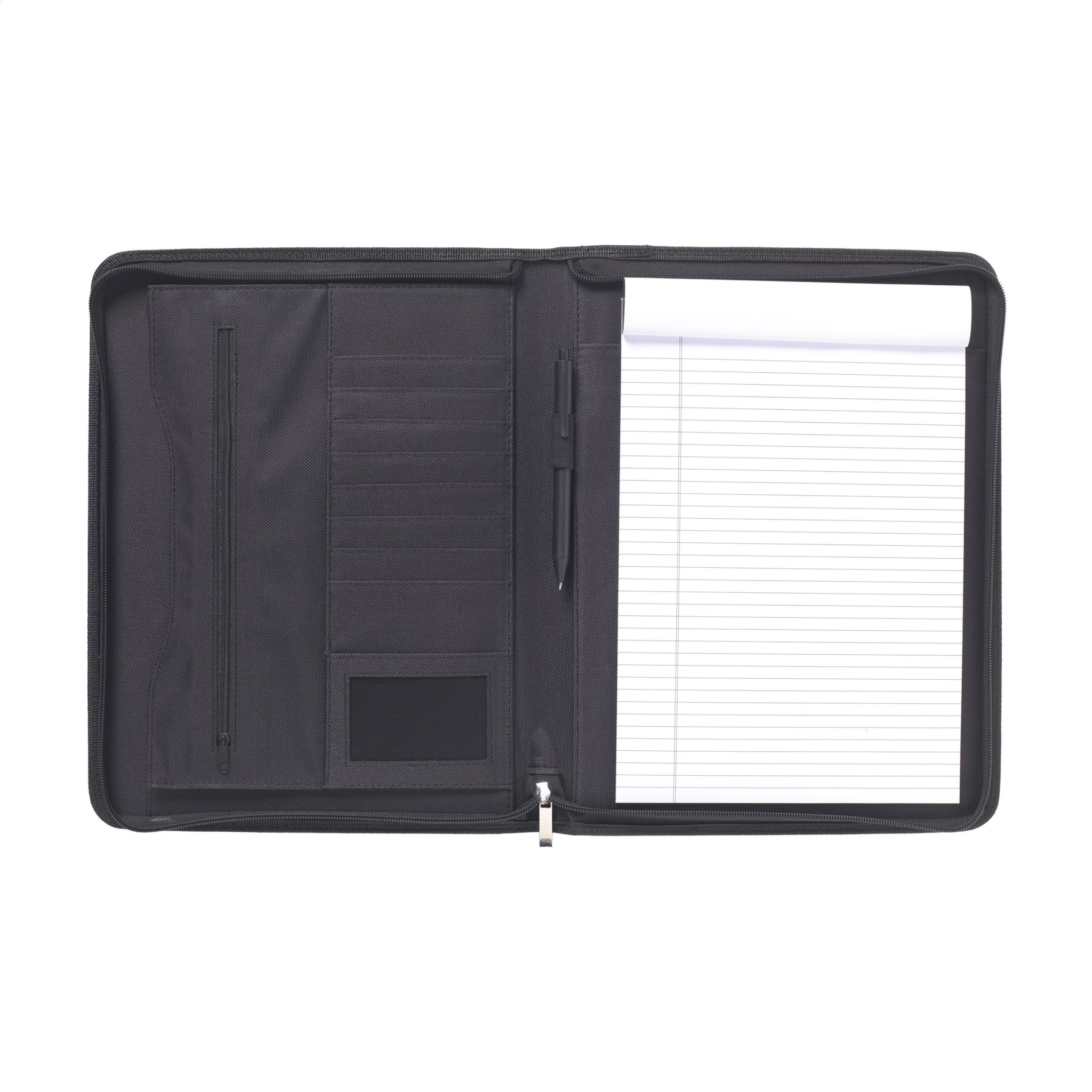 A4 formato konferencijų/dokumentų aplankas pagamintas iš plonos, klijuotos odos. Su keliomis kišenėmis, vizitinių kortelių lizdais ir užtrauktuku. Įsk. rašymo bloknotas ir tušinukas. Kiekviena prekė supakuota atskirai.