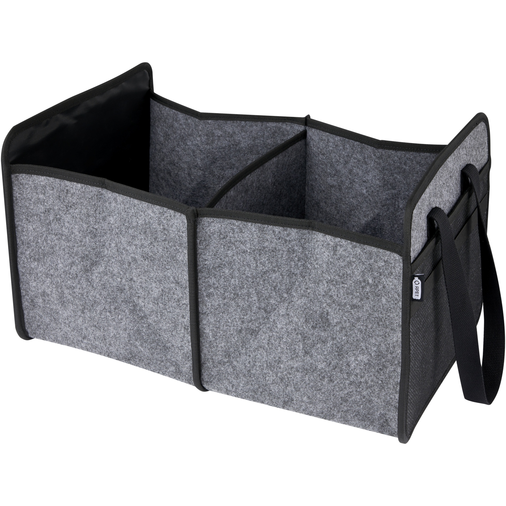 Saliekams bagāžnieka organizators no mīksta un izturīga augstas kvalitātes GRS sertificēta otrreizēji pārstrādāta filca. Ietver 2 lielus nodalījumus ar nostiprinātām apakšējām plāksnēm, priekšējo kabatu, sieta kabatu un 2 gariem austiem kokvilnas rokturiem (30 x 2,5 cm). Ideāli piemērots jūsu elektriskā transportlīdzekļa uzlādes kabeļu glabāšanai, pārtikas preču pārnēsāšanai vai vienkārši visu sakārtotu jūsu automašīnā vai mājās. Saliekams vietā bez piepūles, un elastīgā siksna nodrošina, ka tā paliek kārtīgi salocīta. Dziļums slēgts: 4,5 cm. Atvēršanas dziļums: 48 cm.