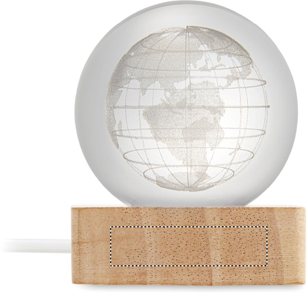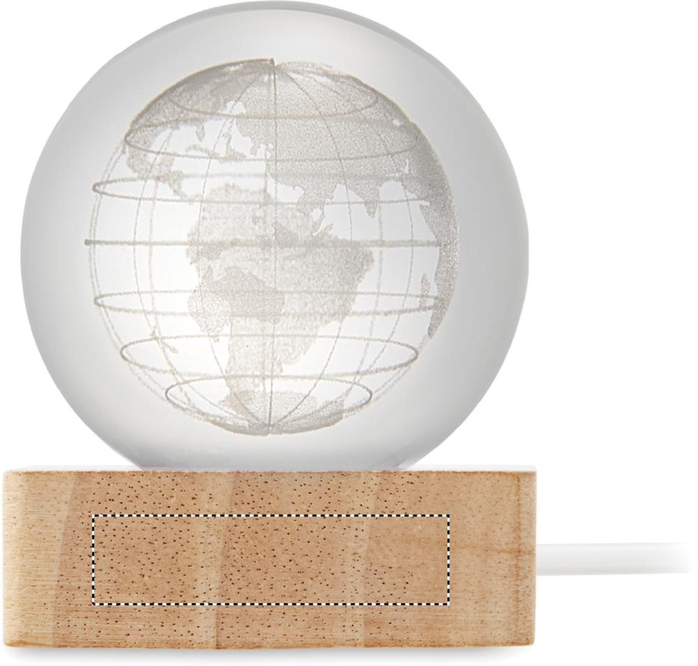 Stikla lodveida bumba ar LED gaismu (100 lūmeni) uz gumijas koka pamatnes. Komplektā ietilpst USB uzlādes kabelis (90 cm).