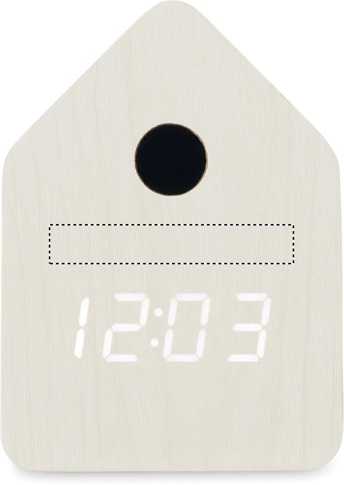 Mazs MDF galda pulkstenis ar iebūvētu modinātāju ar putna dzeguzes balsi un temperatūras displeju. Putna dzeguzes balss atskan katru pilnu stundu un modinātāja laikā. Balts LED displejs. Skaņa tiek automātiski apklusināta no plkst. 22.00 līdz 06.00. 5 minūšu atlikšanas intervāli.