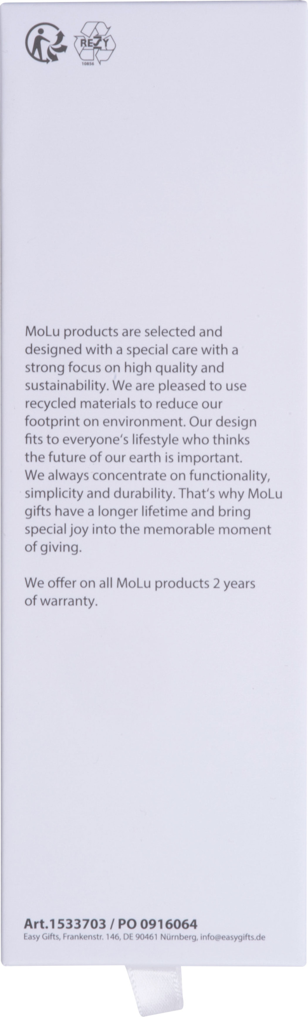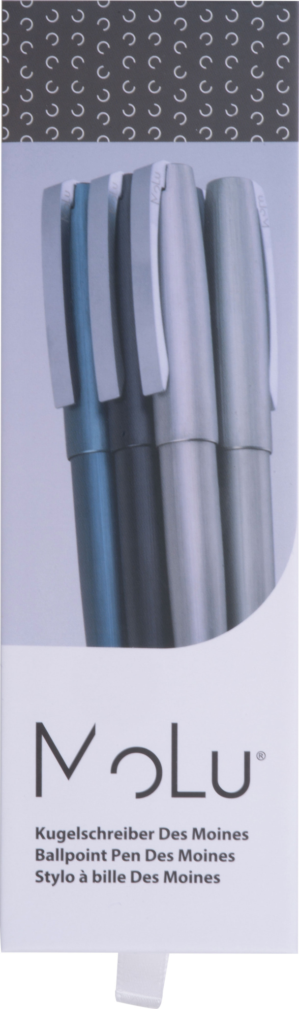 MoLu metāla lodīšu pildspalva – caurspīdīga. Jaudīga. Ar raksturu. Ar platu klipsi un augstas kvalitātes Parker sistēmas uzpildi – zila tinte un nomaināma. Piegādāts elegantā, bīdāmā atsevišķā kastītē – gatava atstāt iespaidu. Izturīga metāla konstrukcija, precīzi izstrādāta – rakstīšana ar stilu.