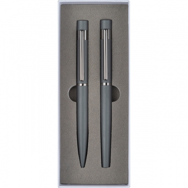 Elegance un komforts vienā komplektā! Ietver lodīšu pildspalvu un rullīšu bumbiņu, abām ir zilas krāsas uzpildes un gumijota virsma optimālam satvērienam un stilīgam dizainam. Lieliski piemērots ikdienas lietošanai vai kā personīga dāvana.