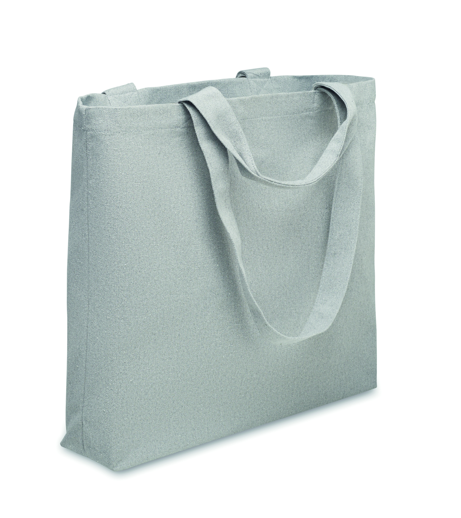 Iepirkumu/pludmales soma no pārstrādātiem audumiem (60% pārstrādāta kokvilna, 40% pārstrādāts poliesters) ar īsiem un gariem rokturiem. 320 gr/m².