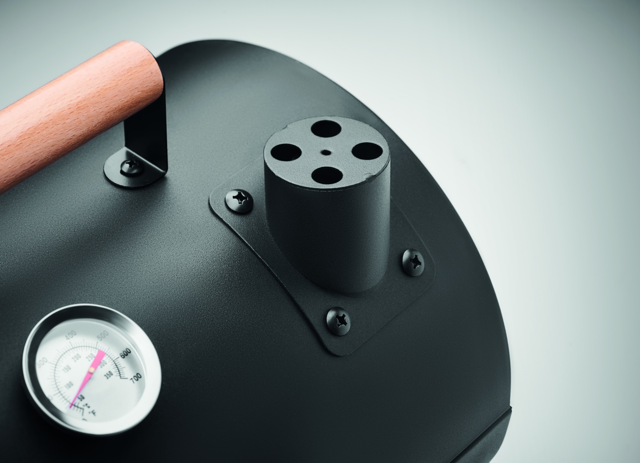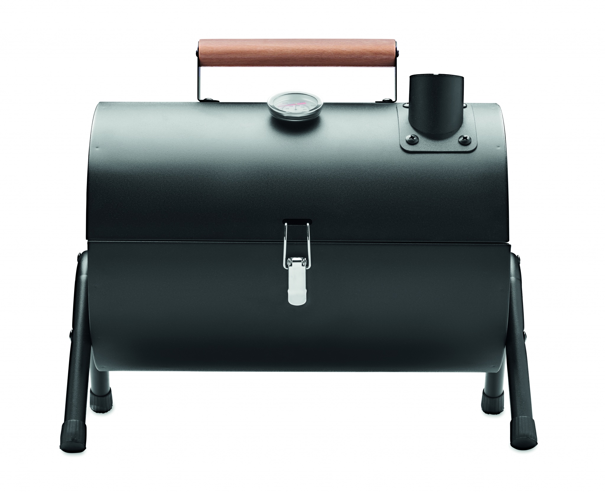 Переносной железный барбекю-мангал с дымоходом и термометром. Черный цвет. Фиксатор и деревянная ручка для переноски.